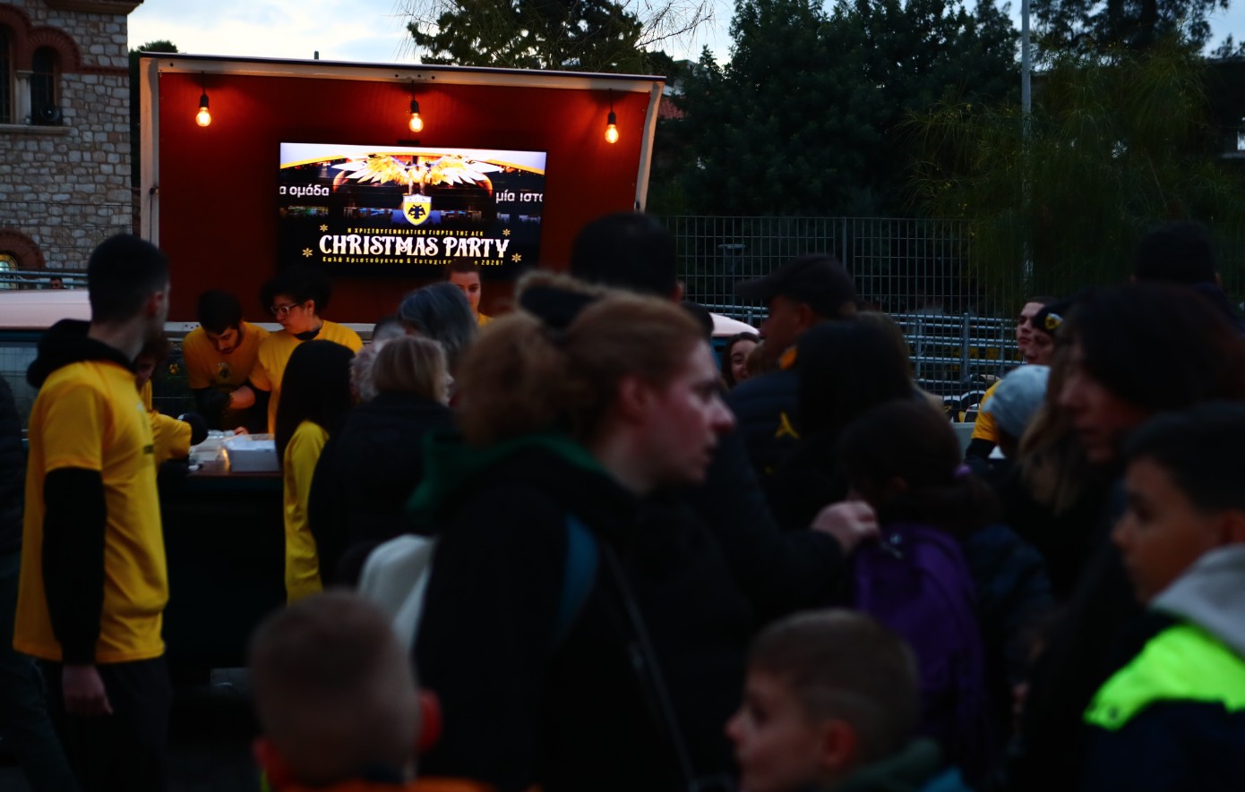 Λίγες ώρες πριν τον αγώνα με τον ΟΦΗ, η ΑΕΚ έχει τη Χριστουγεννιάτικη γιορτή της έξω από την OPAP Arena και η πλατεία του Αετού έχει γεμίσει με κόσμο, ο οποίος… πανηγυρίζει για τα γκολ στο 3-2 επί της Κραϊόβα.