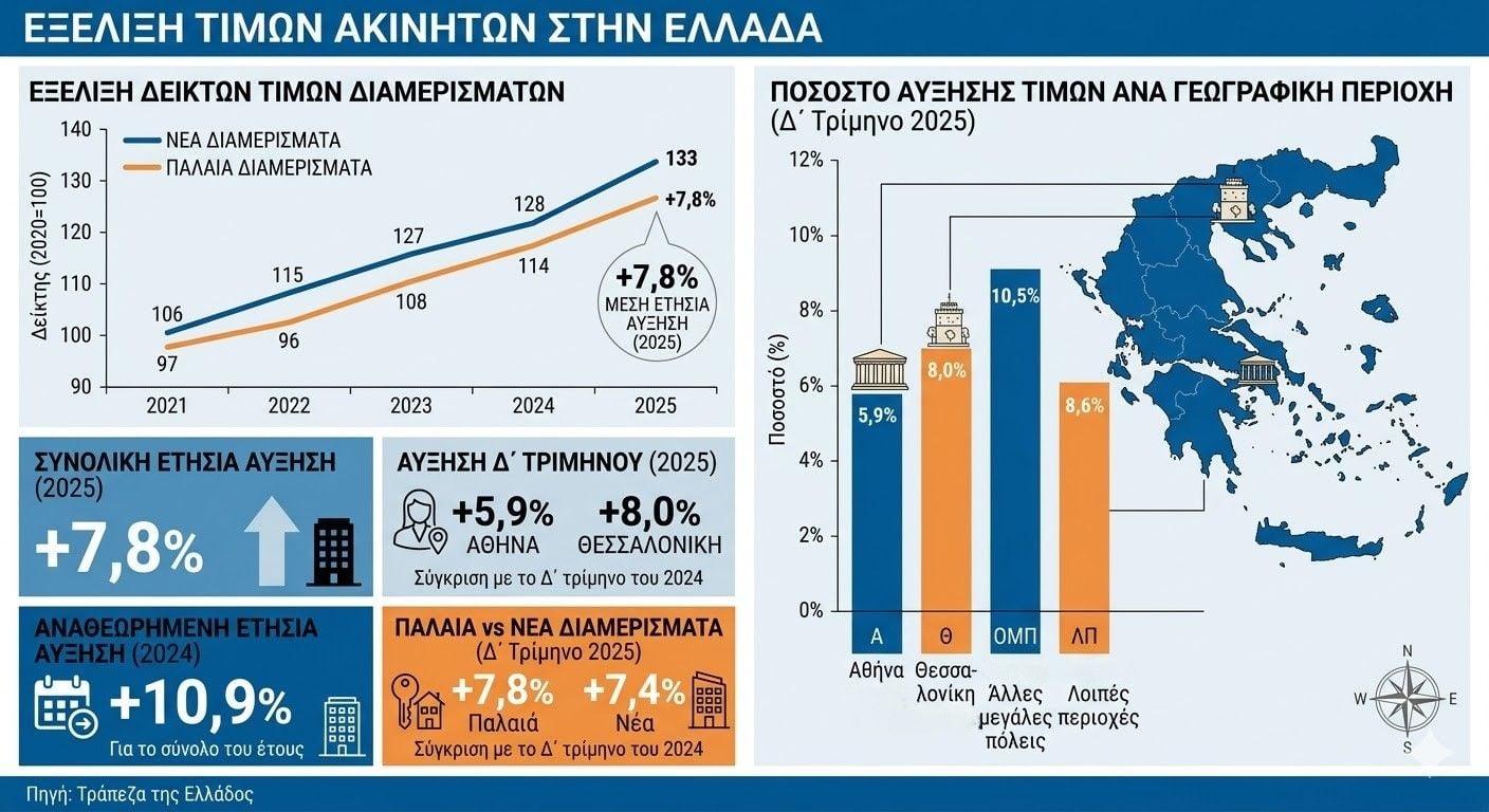 Συνεχίστηκε η ανοδική πορεία των τιμών στην ελληνική κτηματαγορά κατά το τελευταίο τρίμηνο του περασμένου έτους. Σύμφωνα με τα στοιχεία που δημοσιοποίησε η Τράπεζα της Ελλάδος (ΤτΕ), ο ετήσιος ρυθμός μεταβολής των τιμών για τα διαμερίσματα στο σύνολο της χώρας διαμορφώθηκε στο 7,6% το δ΄ τρίμηνο του 2025.