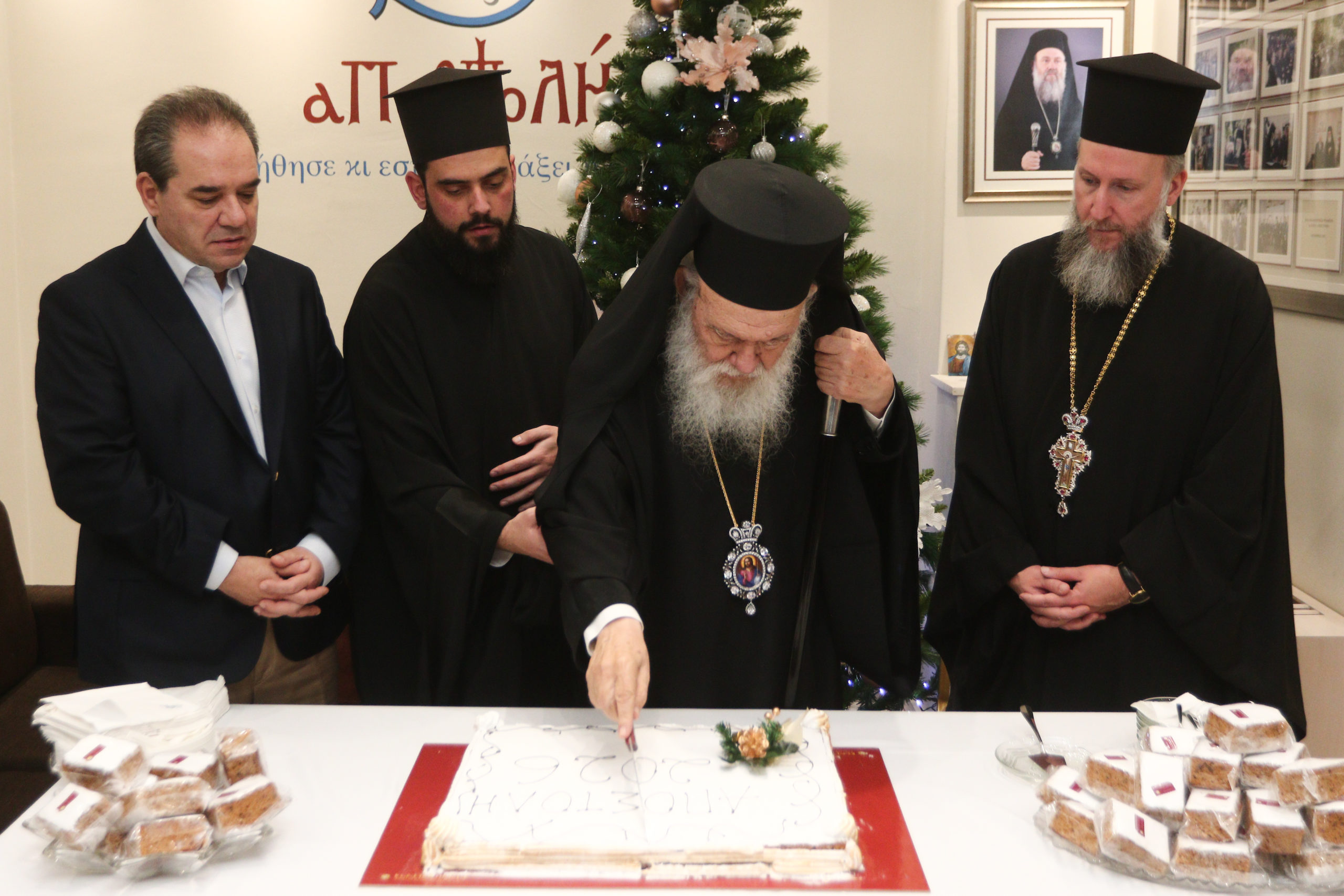 Την πρωτοχρονιάτικη βασιλόπιτα του Φιλανθρωπικού Οργανισμού «ΑΠΟΣΤΟΛΗ», έκοψε σήμερα το μεσημέρι ο Αρχιεπίσκοπος Αθηνών και πάσης Ελλάδος κ.κ. Ιερώνυμος συνοδευόμενος από τον Γενικό Αρχιερατικό Επίτροπο της Ιεράς Αρχιεπισκοπής Αθηνών, Αιδεσιμολογιώτατο Πρωτοπρεσβύτερο π. Εμμανουήλ Παπαμικρούλη και τον Αρχιδιάκονο π. Δημήτριο Φωκιανό.