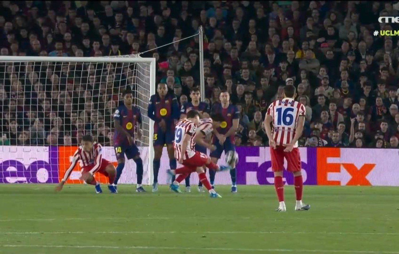 Η Μπαρτσελόνα και η Ατλέτικο Μαδρίτης κοντράρονται στο Καμπ Νου στον πρώτο προημιτελικό του Champions League και στο 45′ ο Άλβαρες έκανε το 0-1 με εκπληκτική εκτέλεση φάουλ.