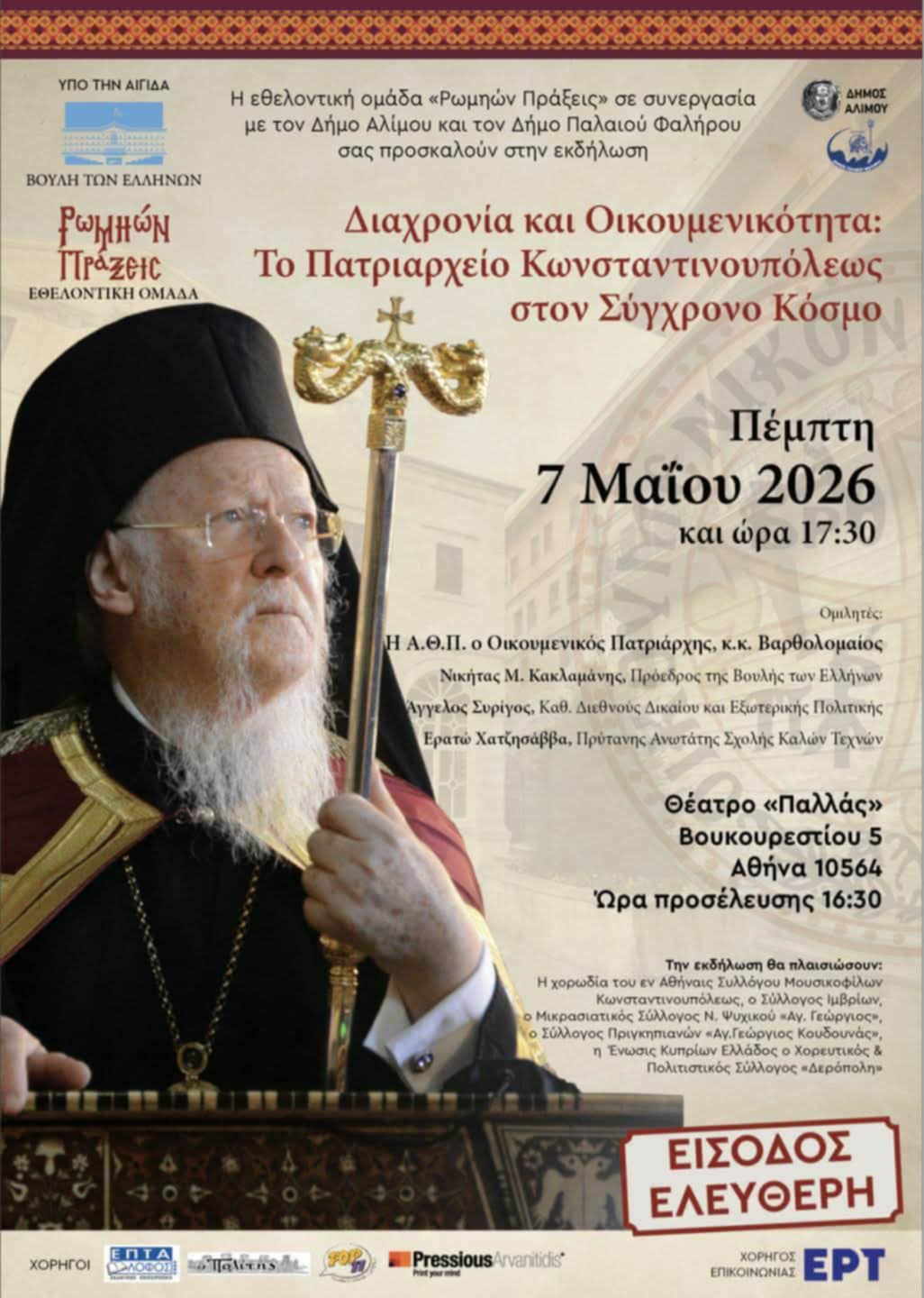 Η εθελοντική ομάδα «Ρωμηών Πράξεις», με την αιγίδα της Βουλής των Ελλήνων και σε συνεργασία με τον Δ. Αλίμου και τον Δ. Παλαιού Φαλήρου διοργανώνει στο Θέατρο «Παλλάς» την εκδήλωση με τίτλο «Διαχρονία και Οικουμενικότητα: Το Πατριαρχείο Κωνσταντινουπόλεως στον Σύγχρονο Κόσμο» την Πέμπτη, 7 Μαΐου 2026 και ώρα 17:30 (έναρξη προσελεύσεως ώρα 16:30 – πέρας προσελεύσεως ώρα 17:15).