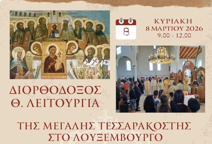 Την Κυριακή 8 Μαρτίου 2026, θα τελεσθεί στον Καθεδρικό Ναό Αγίου Νικολάου Λουξεμβούργου, Rue du Schlammestée 1Α, L-5770 Weiler-la-Tour, ΔΙΟΡΘΟΔΟΞΟΣ ΘΕΙΑ ΛΕΙΤΟΥΡΓΙΑ, με την συμμετοχή ιερέων και διακόνων των διαφόρων Ορθοδόξων Παρουσιών στο Λουξεμβούργο και περισσοτέρων χορωδιών.