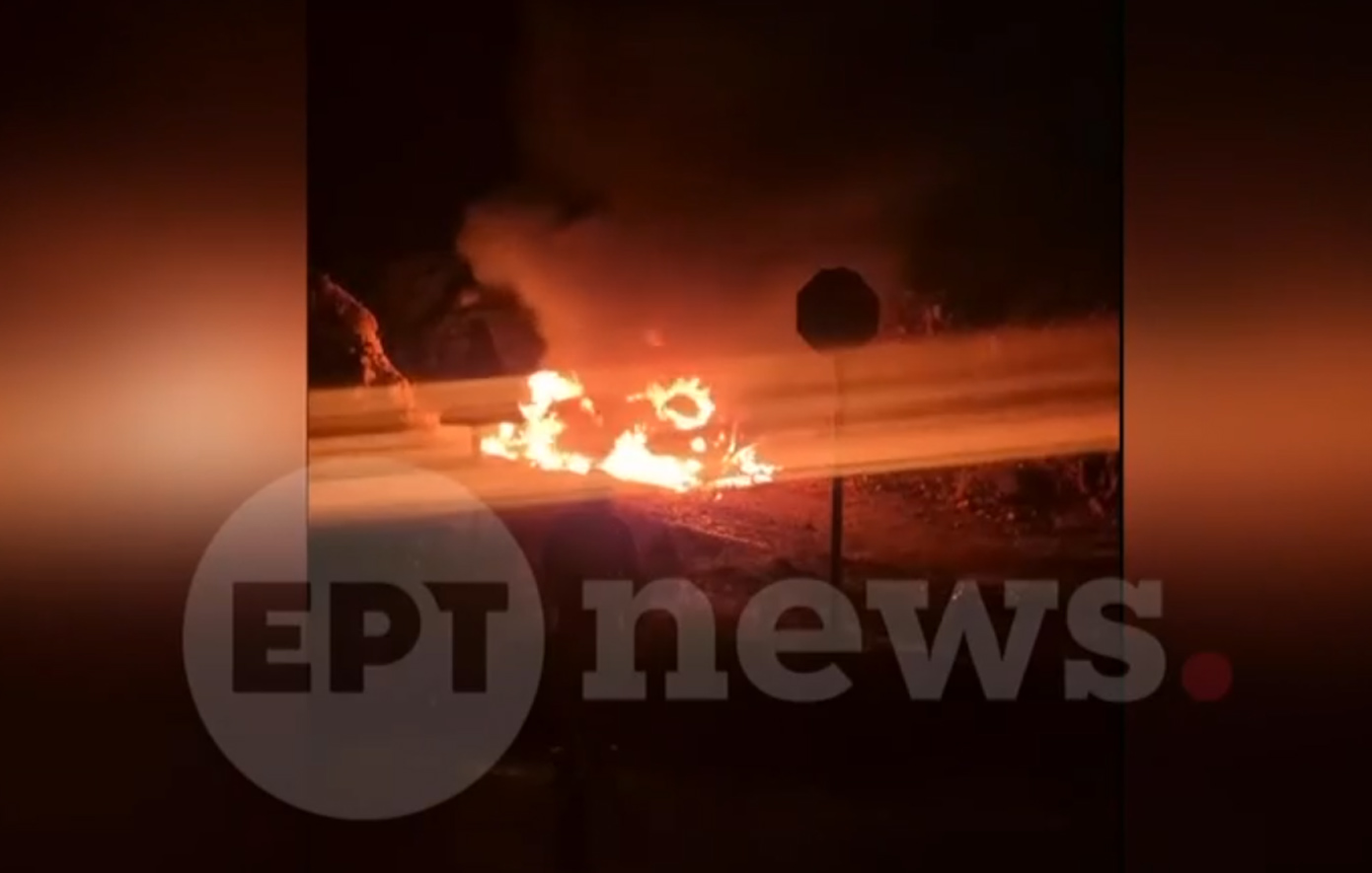 Η ΕΡΤ μετέδωσε βίντεο που δείχνει το όχημα στις φλόγες και ανέφερε ότι οι αστυνομικοί μετά την κατάσβεση εντόπισαν στα πίσω καθίσματα δύο όπλα.