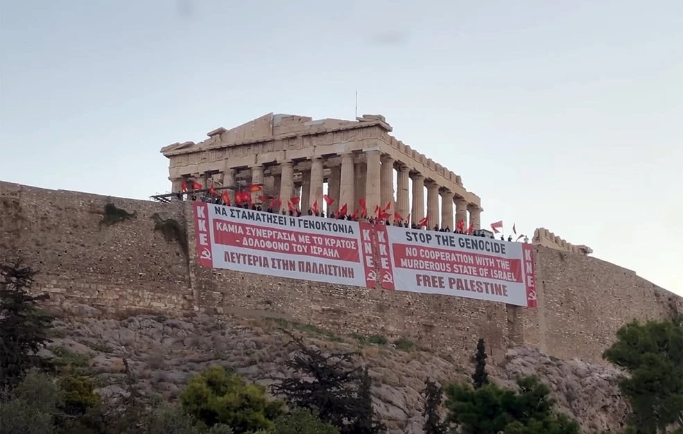 Ένα γιγαντοπανό κρέμασαν στην Ακρόπολη το πρωί της Παρασκευής 19/9 μέλη του ΚΚΕ και της ΚΝΕ ζητώντας να σταματήσει η γεγονοκτόνια στη Γάζα.