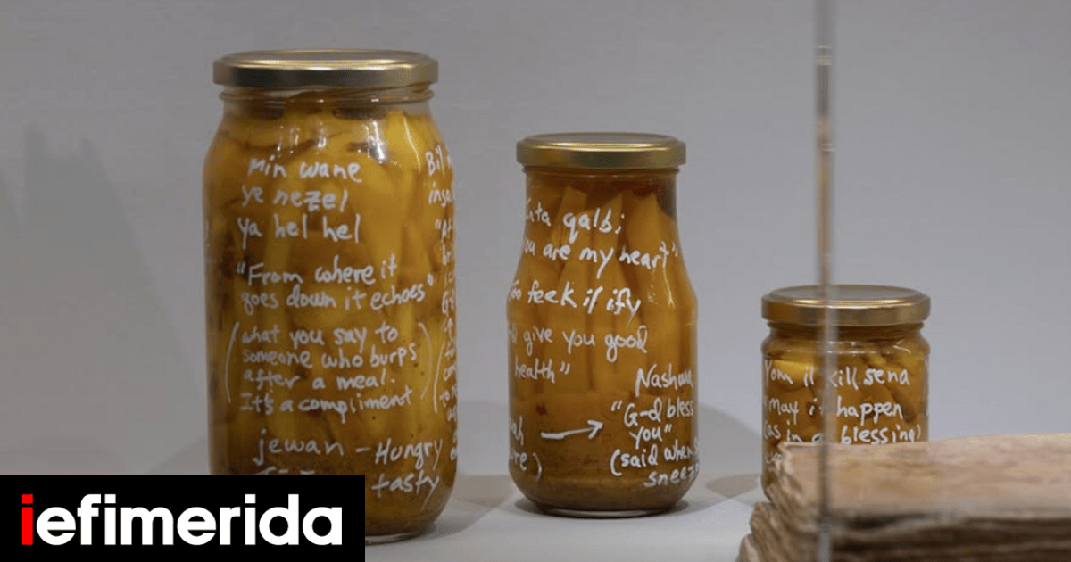 Νιώθω την επίμονη μυρωδιά της κανέλας, που στην πραγματικότητα δεν υπάρχει, είναι ένα σκηνοθετημένο εύρημα της ίδιας μου της φαντασίας, καθώς προσέρχομαι στον χώρο των περιοδικών εκθέσεων του Μουσείου Ακρόπολης, για να δω μια έκθεση όπου οι συνταγές μίας μητέρας από τη Βαγδάτη που μεγαλώνει τα παιδιά της στη Νέα Υόρκη, γίνονται η κλωστή που ενώνει τα έργα τέχνης και τις προθέσεις του δημιουργού.