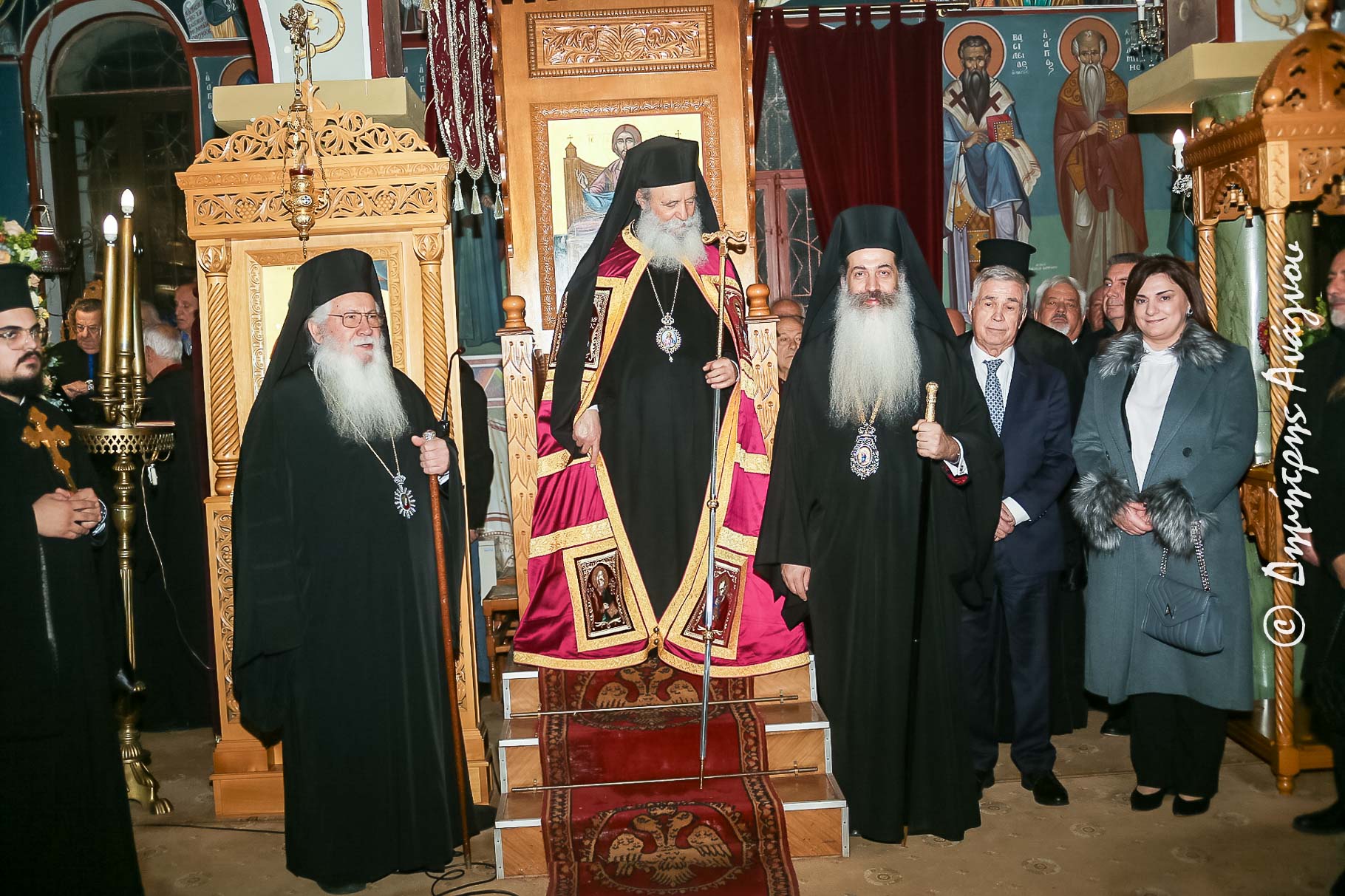 Εόρτιο χαιρετισμό απηύθυνε και ο Σεβασμιώτατος κ. Γεώργιος, ο οποίος εξέφρασε την συγκίνησή του που για μία ακόμη φορά βρέθηκε κοντά στους ευλαβείς κατοίκους αυτής της μικρής ενορίας, ενώ αναφέρθηκε και με ιδιαίτερη συγκίνηση στην προσωπική πολύχρονη πνευματική και καρδιακή του σχέση με τον γείτονα Μητροπολίτη του κ. Συμεών.