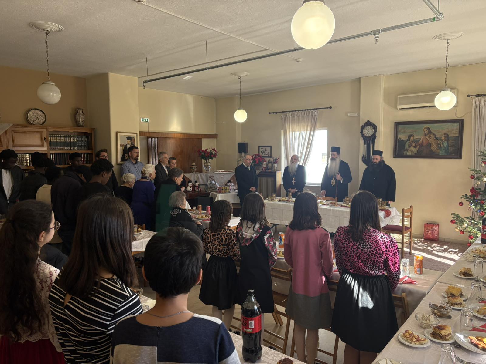 Φέτος όμως τα εόρτια αυτά γεύματα του Σεβασμιωτάτου είχαν μία όμορφη ιδιαιτερότητα: συνδαιτυμόνες του κ. Συμεών και των παιδιών ήταν και οι εξ Αφρικής μαθητές και μαθήτριες του Πρότυπου Εκκλησιαστικού Σχολείου «Ο Όσιος Βησσαρίων Αγαθωνίτης» από την Ζάμπια και Μοζαμβίκη, που φιλοξενούνται από την Ιερά Μητρόπολη Φθιώτιδος εδώ και σχεδόν ένα χρόνο, σπουδάζουν επιτυχώς την ελληνική γλώσσα, την ορθόδοξη θεολογία και τον ελληνικό πολιτισμό.