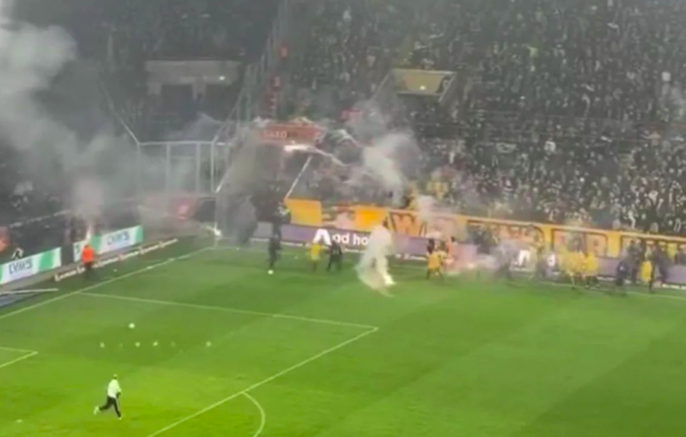 Ο αγώνας, τελικά, διακόπηκε προσωρινά, με την αστυνομία να απομακρύνει τους οπαδούς της Ντιναμό Δρέσδης που κινήθηκαν προς την εξέδρα των φιλοξενούμενων, χωρίς πάντως να έχει ανακοινωθεί ακόμη αν υπάρχουν προσαγωγές ή συλλήψεις.