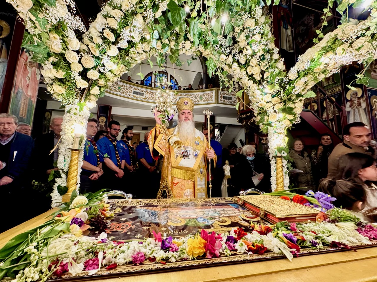 Στην ιερά Ακολουθία παρέστησαν συμπροσευχόμενοι και συμψάλλοντες εκπρόσωποι των πολιτικών, δημοτικών και στρατιωτικών αρχών της πόλεως.