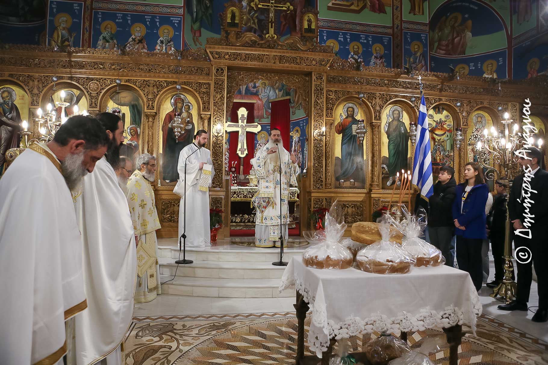 Τον Εσπερινό της εορτής ο Σεβασμιώτατος Μητροπολίτης Φθιώτιδος κ. Συμεών τον τέλεσε στο Καθολικό της Ιεράς Μονής Αγίου Γεωργίου Μύλων Πελασγίας, και ακολούθως στο Αρχονταρίκι της Μονής ευλόγησε την Αγιοβασιλόπιτα της Αδελφότητος, ευχόμενος πατρικώς στην Οσιολογιωτάτη Αγία Καθηγουμένη Γερόντισσα Ιουστίνα και την Μοναχή Αναστασία.