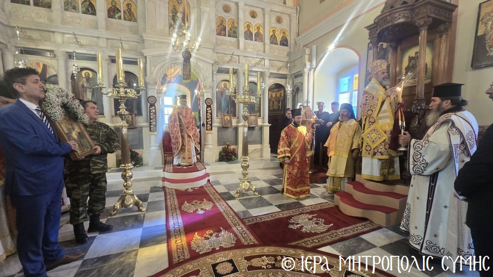 Σήμερα το πρωί, ο Σεβ. Μητροπολίτης Σύμης κ. Χρυσόστομος χοροστάτησε του Όρθρου και τέλεσε την Θεία Λειτουργία με συλλειτουργούς του, τον Θεοφιλ. Βοηθό του Επίσκοπο Ροδοστόλου κ. Αντώνιον και άπαντες τους Εφημερίους της Νήσου, κατά την τοπική παράδοση, σύμφωνα με την οποία κατά την πανήγυρη των Ενοριακών Ναών, τελείται η λεγομένη «Μονοεκκλησιά», δηλ. λειτουργείται μόνο ο εορτάζων Ι. Ναός με την συμμετοχή όλων των Εφημερίων της Σύμης. Τα ι. Αναλόγια διηκόνησαν οι Ιεροψάλτες, κ.κ. Δημοσθένης και Μερκούριος Γιανναράς, Ελευθέριος Ξηράκης, Αγαπητός Μιχελλής και Ευάγγελος Λαγός.
