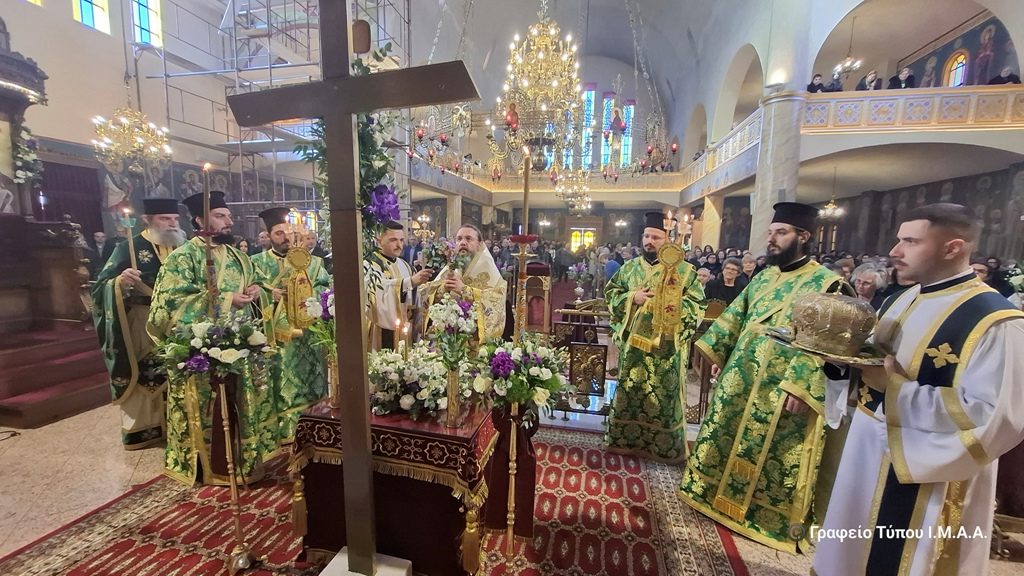 Το πρωί της Κυριακής 15 Μαρτίου 2026 Μητροπολίτης Αιτωλίας και Ακαρνανίας κ. Δαμασκηνός χοροστάτησε στην Ακολουθία του Όρθρου και τέλεσε την Αρχιερατική Θεία Λειτουργία στον ίδιο Ιερό Ναό. Αμέσως μετά, ο Σεβασμιώτατος προεξήρχε της τελετής της λιτανεύσεως και της προσκυνήσεως του Τιμίου και Ζωοποιού Σταυρού, σύμφωνα με το τυπικό της ημέρας.