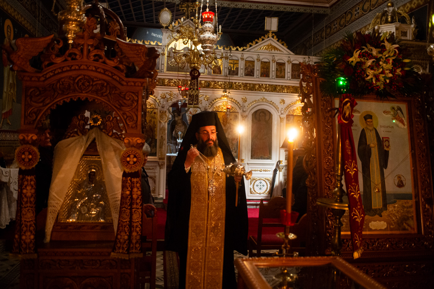 Λόγω των δυσμενών καιρικών συνθηκών και του πολυπληθούς εκκλησιάσματος, η Αγρυπνία τελέσθηκε στον Ιερό Προσκυνηματικό Ναό της Ζωοδόχου Πηγής, πλησίον του οποίου ανηγέρθη το πρώτο Παρεκκλήσιο προς τιμήν του Οσίου Βησσαρίωνος. Στο συγκεκριμένο Ναό της Ζωοδόχου Πηγής και ενώπιον της Ιεράς Εικόνος της Παναγίας της Πεταλιδιωτίσσης, ο μικρός τότε Ανδρέας Κορκολιάκος και μετέπειτα Όσιος Βησσαρίων, βαπτίσθηκε, γαλουχήθηκε πνευματικά και έμελλε να λάβει την κλήση από τον Κύριο, αφού ο Ναός και το Εικόνισμά Της αποτελούσαν το πνευματικό του καταφύγιο στα παιδικά και νεανικά του χρόνια.