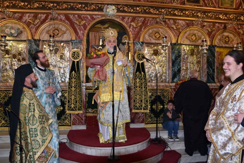 Λίγο πριν το «Δι’ ευχών», ο Θεοφιλέστατος κ. Νικόδημος ευχήθηκε εορτίως στον συλλειτουργό Αρχιδιάκονο του Μητροπολιτικού Ναού των Αθηνών Ιωάννη Καρπασινό, ο οποίος επέλεξε να έρθει να εορτάσει μαζί μας τα ονομαστήριά του ως αδελφός. Τον ευχαρίστησε για την παρουσία του και του ευχήθηκε να τον αξιώνει ο Θεός κρειττόνων χαρισμάτων. Επίσης, αφού εδήλωσε τη χαρά του, για την πολυπληθή συμμετοχή των εκκλησιασθέντων και ευχήθηκε σε όλους εορτίως, εξέφρασε λόγους τιμής, επαίνου και ευχαριστίας προς μεν τον επί πεντηκονταετία πρωτοψάλτη της Ενορίας κ. Ιωάννη Κουρούπη και προς τον προσφάτως λαβόντα Πτυχίο Βυζαντινής Μουσικής, από τη Σχολή της Ι. Μητροπόλεως, λαμπαδάριο κ. Γεώργιο Αλεξίου.