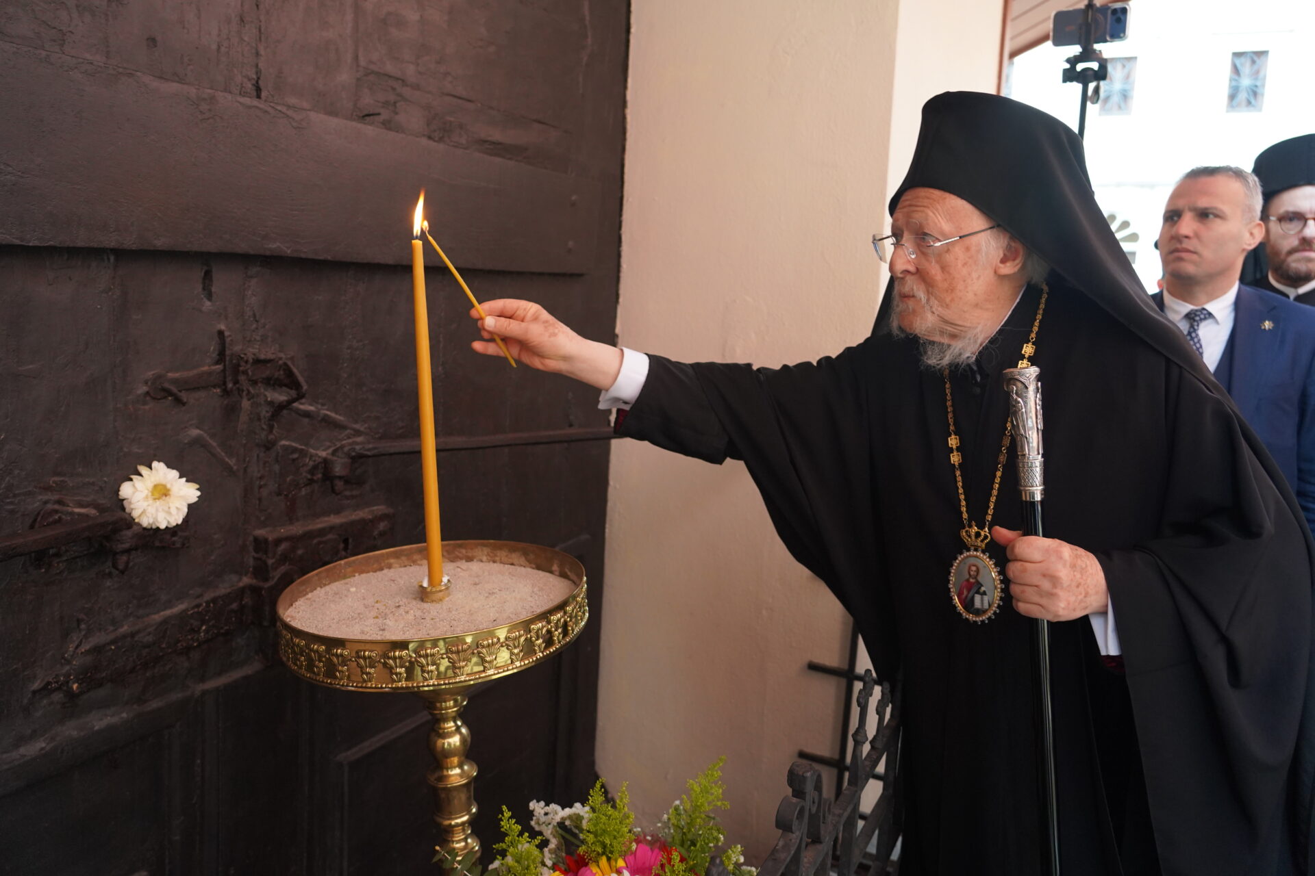 Αμέσως μετά την Ακολουθία της Αποκαθηλώσεως που τελέστηκε το πρωί της Μεγάλης Παρασκευής, 10 Απριλίου 2026, στον Πάνσεπτο Πατριαρχικό Ναό, ο Παναγιώτατος Οικουμενικός Πατριάρχης κ.κ. Βαρθολομαίος, όπως κάθε χρόνο στις 10 Απριλίου, άναψε κερί και κατέθεσε ανοιξιάτικα άνθη στην κλειστή Πύλη του Πατριαρχείου, τόπο του απαγχονισμού του Ιερομάρτυρα προκατόχου του, Γρηγορίου Ε’ τιμώντας τη μνήμη του.