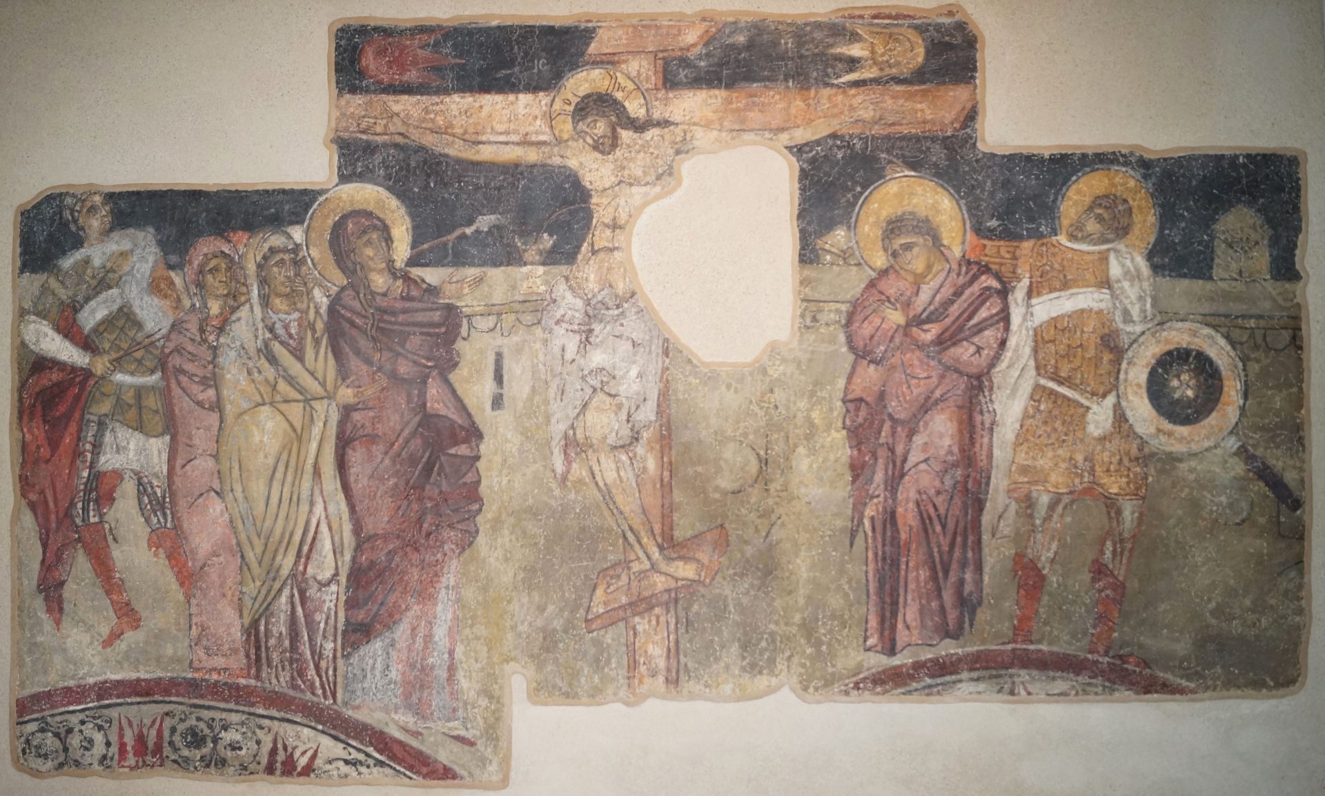 Στο πνεύμα των ημερών της Μεγάλης Εβδομάδας, η δράση συνεχίζεται με την παρουσίαση της αποτοιχισμένης τοιχογραφίας με την παραπάνω παράσταση της Σταύρωσης.