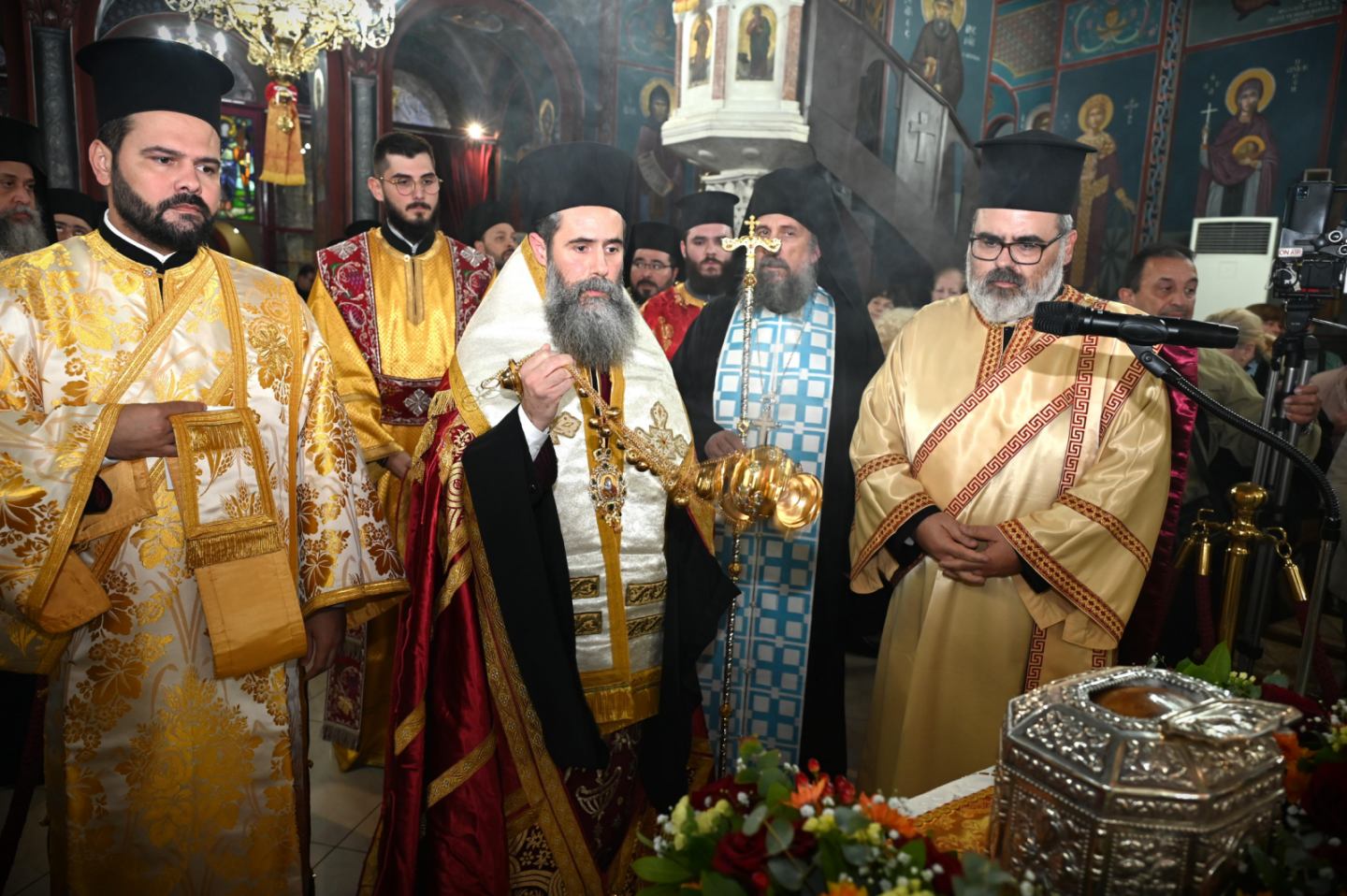 Στην αντιφώνησή του ο Θεοφιλέστατος Επίσκοπος Χριστουπόλεως κ. Βαρνάβας εξήρε την αγιότητα των Αγίων μας, η χάρις των οποίων μας αγιάζει και μας θυμίζει την αρετή και την πίστη στον Σωτήρα Χριστό. Τα ιερά λείψανα αποτελούν πηγή ιαμάτων και χάριτος, είναι φυλακτήρια και μας οδηγούν στη σωτηρία και η παρουσία της τιμίας Κάρας του Αγίου Παντελεήμονος είναι ευλογία για όλους μας. Σκοπός μας είναι να γίνουμε κατά χάριν Θεοί και να κληρονομήσουμε την βασιλεία των ουρανών.