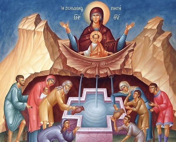 Έτσι την Παναγία μας, που την τιμάμε όλη την διάρκεια της Σαρακοστής με την ακολουθία των Χαιρετισμών, την τιμάμε και αμέσως μετά την ανάσταση με τη γιορτή της Ζωοδόχου Πηγής. Θα λέγαμε ότι η γιορτή αυτή είναι και η πρώτη θεομητορική γιορτή μετά την ανάσταση του Χριστού. Και η γιορτή αυτή δεν είναι τόσο η ανάμνηση του σπουδαίου αυτού γεγονότος, της ευρέσεως δηλαδή του αγιάσματος της Παναγίας μας και της ανεγέρσεως του ναού, όσο ένας πανηγυρισμός και μία υπενθύμιση της ζωντανής πραγματικότητας, ότι η Παναγία μας -κατ’ άνθρωπον- είναι η πηγή της ζωής. Ότι ο Χριστός είναι η αληθινή ζωή. Ότι ο Χριστός μας είναι ο χορηγός της ζωής.