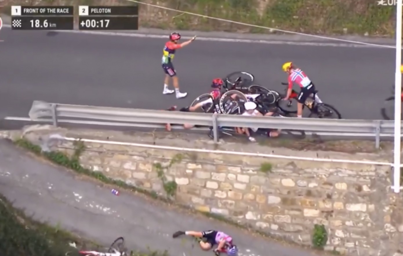 Όλα έγιναν περίπου 20 χιλιόμετρα πριν τον τερματισμό, στην ανάβαση Τσιπρέσα, όπου είχαμε καραμπόλα αρκετών αθλητριών, με τη Ντέμπορα Σιλβέστρι να ακολουθεί και να μην προλαβαίνει να ακινητοποιήσει το ποδήλατό της.