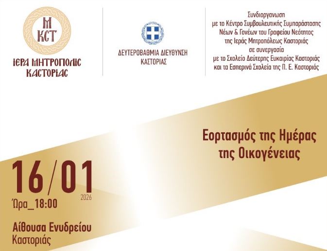 Το Κέντρο Συμβουλευτικής Συμπαράστασης Νέων & Γονέων του Γραφείου Νεότητος της Ιεράς Μητροπόλεως Καστορίας έχει την τιμή να σας προσκαλέσει στην εσπερίδα που διοργανώνεται με αφορμή τον εορτασμό της Ημέρας της Οικογένειας, υπό την αιγίδα της Ιεράς Μητροπόλεως Καστοριάς και της Διεύθυνσης Δευτεροβάθμιας Εκπαίδευσης Καστοριάς.