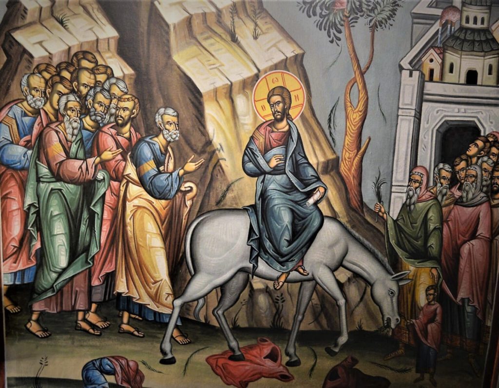 Ο Κύριος καθισμένος πάνω σε πουλάρι όνου έμπαινε ήσυχα, ατάραχος και αδιαφορώντας για τους πανηγυρισμούς, στην αγία πόλη, εκπληρώνοντας την προφητεία του Ζαχαρίου: «Χαίρε σφόδρα θύγατερ Σιών, ιδού ο βασιλεύς σου έρχεταί σοι δίκαιος και σώζων αυτός πραϋς και επιβεβηκώς επί υπόζυγιον και πώλον νέον» (Ζαχ. 9,9). Ο κόσμος επισημαίνει ο ιερός ευαγγελιστής ομολογούσε ότι «τον Λάζαρον εφώνησεν εκ του μνημείου και ήγειρεν αυτόν εκ νεκρών. Δια τούτο και ηπήντησεν αυτώ ο όχλος, ότι ήκουσαν τούτο αυτόν πεποιηκέναι το σημείον» (Ιωάν. 12,17-18). Αντίθετα με τους ενθουσιασμούς του πλήθους, οι Φαρισαίοι με εμφανή ανησυχία και μίσος είπαν μεταξύ τους: «θεωρείτε ότι ουκ ωφελείτε ουδεν; Ίδε ο κόσμος οπίσω αυτού απήλθεν» (Ιωάν. 12,19).