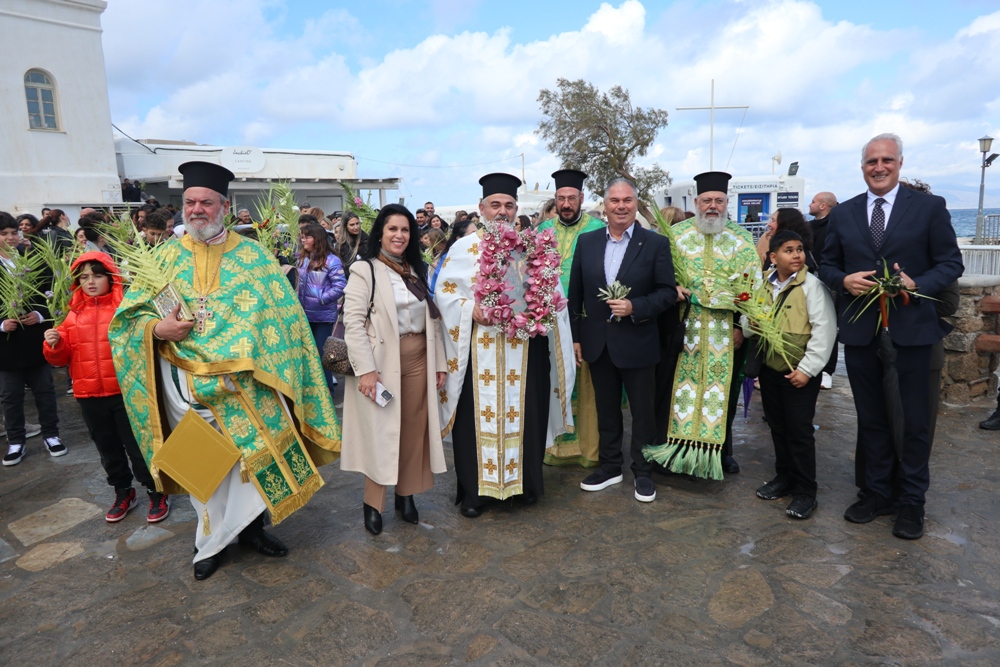 Εν συνεχεία, ακολούθησε η λαμπρά λιτανευτική πομπή της Βαϊοφόρου, από τον ιστορικό Ναό της Αχειροποιήτου Παραπορτιανής και τον πάλαι ποτέ Μητροπολιτικό Ναό της Αγίας Βασιλομήτορος Ελένης, στην παραλία και τα γραφικά δρομάκια της Μυκόνου, την οποία ακολούθησε πλήθος πιστών Μυκονίων, μεταξύ των οποίων η Βουλευτής Κυκλάδων της Νέας Δημοκρατίας κα Αικατερίνη Μονογυιού, ο Δήμαρχος Μύκονου κ. Χρήστος Βερώνης, Περιφερειακοί και Δημοτικοί Σύμβουλοι, εκπρόσωποι τοπικών Αρχών και Υπηρεσιών και ο Πρόεδρος του Σωματείου «Μυκονιάτικη Αλληλεγγύη».