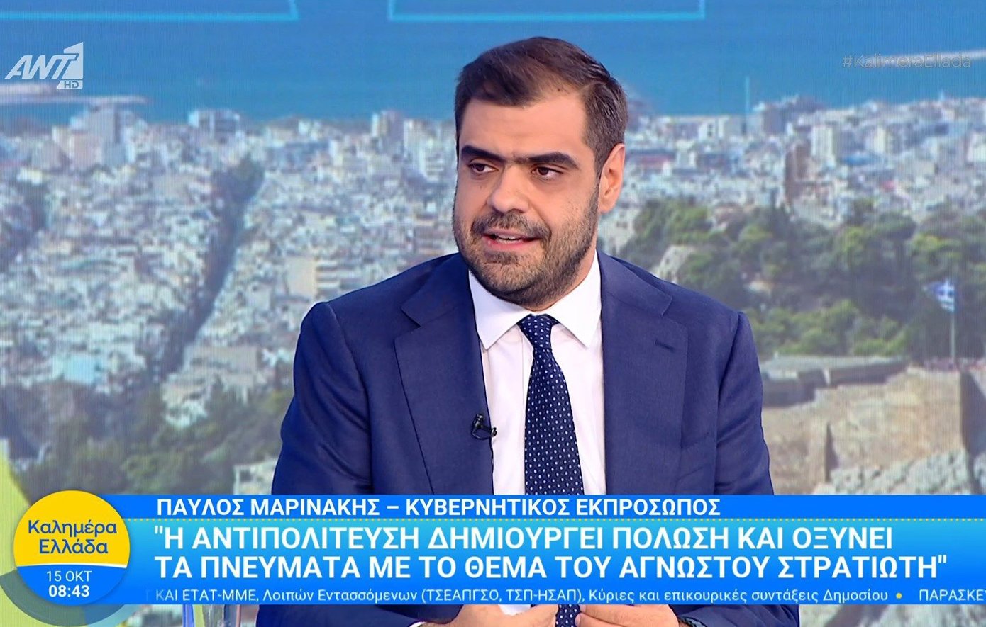 «Νομίζω ότι επιβεβαιώνεται αυτό το οποίο είπα προχθές στην ενημέρωση πολιτικών συντακτών, ότι η κυβέρνηση εναρμονίζεται με αυτονόητα αιτήματα της κοινωνίας, της συντριπτικής πλειονότητας των πολιτών -που δεν είναι ούτε ακροδεξιοί, ούτε ακραίοι εν γένει, λέγοντας ‘παιδιά, επιτέλους, και αργήσατε’- και η αντιπολίτευση είναι εντελώς αντίθετη με αυτό το οποίο λέει η κοινωνία», ανέφερε ο κυβερνητικός εκπρόσωπος Παύλος Μαρινάκης μιλώντας για το θέμα της προστασίας του μνημείου του Αγνώστου Στρατιώτη σε τηλεοπτική συνέντευξή του στην εκπομπή του ΑΝΤ1 «Καλημέρα Ελλάδα».