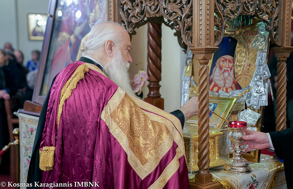 Στην Ιερά Ακολουθία μεταφέρθηκε από το σκευοφυλάκιο της Ιεράς Μονής η κοινή λειψανοθήκη που περιέχει τεμάχια των χαριτοβρύτων Ιερών Λειψάνων των Αγίων Τριών Ιεραρχών, Βασιλείου του Μεγάλου, Γρηγορίου του Θεολόγου και Ιωάννου του Χρυσοστόμου, με την ευκαιρία της επικείμενης εορτής τους.
