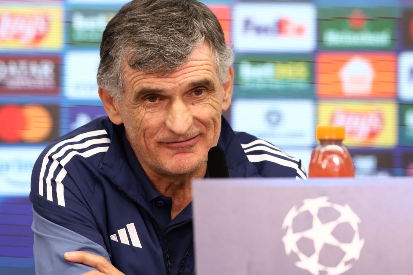 Αν θα χρησιμοποιήσει κομμάτια του λόγου του από την ομιλία με την Μακάμπι πριν το αυριανό ματς: «Όχι, γιατί έχει περάσει πολύς καιρός, είναι μια διαφορετική διοργάνωση με άλλον αντίπαλο, δεν θα σκεφτόμαστε την πρόκριση τότε, αλλά να κάνουμε ένα καλό παιχνίδι. Δεν έχουμε την πίεση, δεν είναι το μυαλό μας απευθείας στην πρόκριση, αλλα να κάνουμε ένα καλό παιχνίδι και να πάρουμε τη νίκη όπως θέλουμε να κάνουμε κάθε φορά. Αν το κάνουμε σκοράροντας πάνω από δύο γκολ και να περάσουμε, τότε θα είναι όλα ωραία».