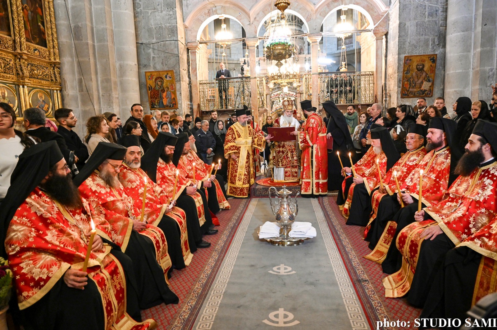 Μετά την απόλυση της Θείας Λειτουργίας, η Πατριαρχική Συνοδεία εξήλθε από τον Καθεδρικό Ναό του Αγίου Ιακώβου και εισήλθε στο Καθολικό του Ναού της Αναστάσεως.
