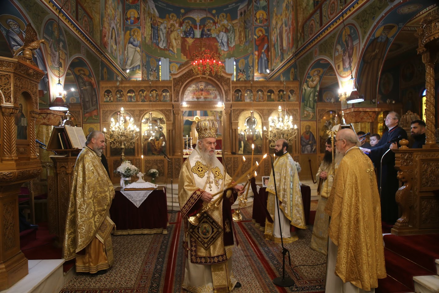 Με τον Σεβασμιώτατο συλλειτούργησαν οι Ιερείς: π. Θωμάς Βαμβίνης, Γενικός Αρχιερατικός Επίτροπος, π. Παναγιώτης Χαντζής, π. Αθανάσιος Νικόπουλος και οι Διάκονοι π. Παΐσιος Παρασκευάς και π. Ιερόθεος Καλλίας.