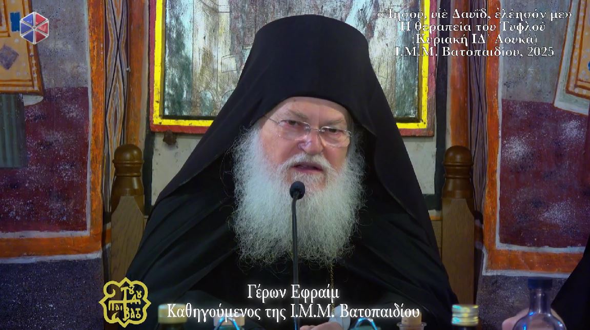 Ο Καθηγούμενος της Ιεράς Μεγίστης Μονής Βατοπαιδίου Γέρων Εφραίμ ομίλησε στην τράπεζα της Ιεράς Μονής για την θεραπεία του τυφλού, την Κυριακή ΙΔ’ Λουκά.