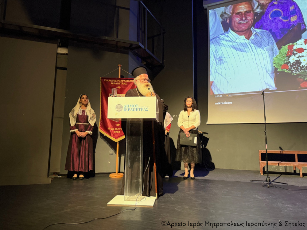 Στην τιμητική και επιτυχημένη εκδήλωση που διοργάνωσε ο Σύλλογος Μικρασιατών Ιεράπετρας το βράδυ της Κυριακής 7 Δεκεμβρίου στην κατάμεστη δημοτική αίθουσα «Μελίνα Μερκούρη» στην Ιεράπετρα παρευρέθηκε και απηύθυνε χαιρετισμό ο Σεβ. Μητροπολίτης Ιεραπύτνης και Σητείας κ. Κύριλλος.