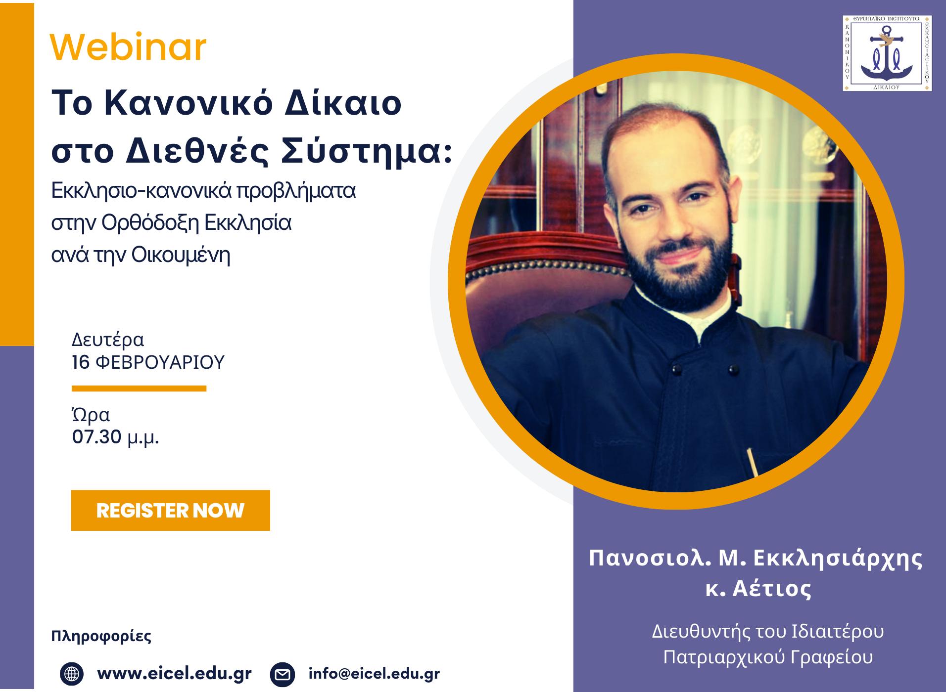 Πρώτος ομιλητής του εαρινού κύκλου σεμιναρίων–webinar «Το Κανονικό Δίκαιο στο Διεθνές Σύστημα: Εκκλησιο-κανονικά προβλήματα στην Ορθόδοξη Εκκλησία ανά Οικουμένη», που διοργανώνεται στο πλαίσιο των εκπαιδευτικών δράσεων του Ευρωπαϊκού Ινστιτούτου Κανονικού και Εκκλησιαστικού Δικαίου (ΕΙΚΕΔ), είναι ο Μ. Εκκλησιάρχης κ. Αέτιος (Νικηφόρος), Διευθυντής του Ιδιαιτέρου Πατριαρχικού Γραφείου. Θέμα εισήγησης: Το Εκκλησιαστικό και Κανονικό Δίκαιο στο μεταίχμιο δύο αιώνων.