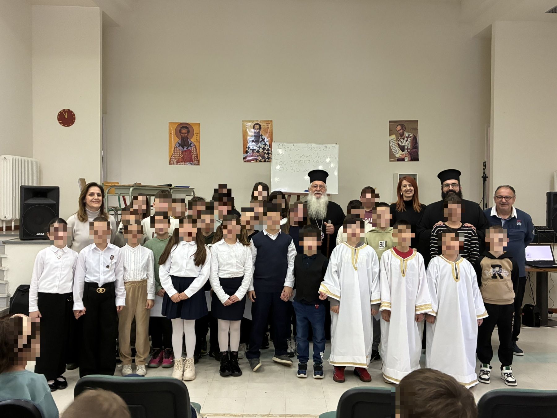 Ο Σεβασμιώτατος συνεχάρη τα παιδιά, τους μίλησε για τους Τρείς Ιεράρχες και τους έδωσε ως ευλογία από μια εικονίτσα της Παναγίας κι ένα στυλό. Επίσης, ευχαρίστησε τον Διευθυντή του Σχολείου κ. Ν. Μπαλιάμη και τους δασκάλους, καθώς και το Σύλλογο Γονέων και Κηδεμόνων.