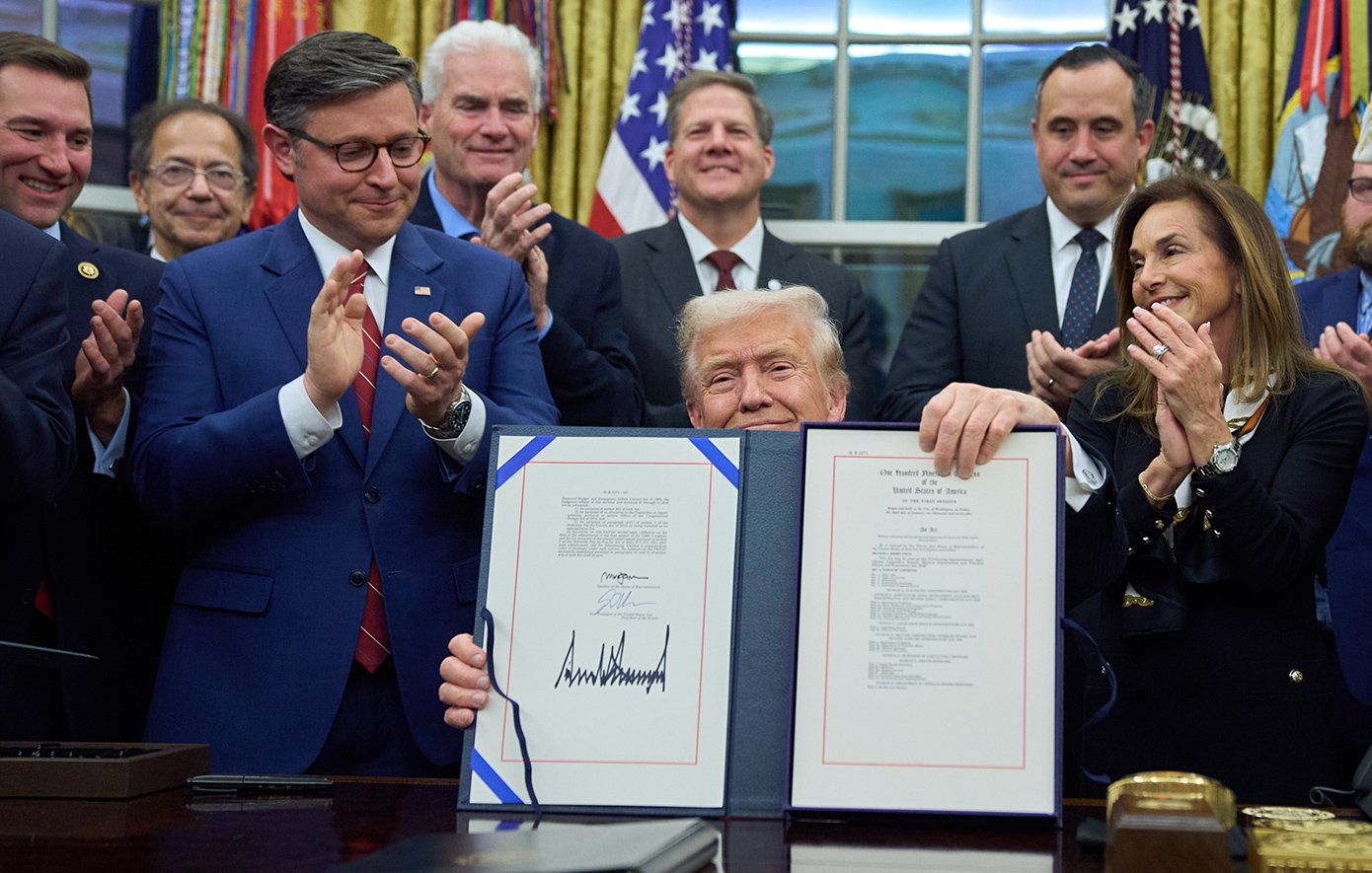 «Σήμερα στέλνουμε το σαφές μήνυμα ότι δεν υποχωρούμε ποτέ σε εκβιασμούς», πέταξε δηκτικά ο μεγιστάνας απευθυνόμενος στους Δημοκρατικούς αντιπάλους του, προτού υπογράψει το κείμενο, επευφημούμενος από Ρεπουμπλικάνους κοινοβουλευτικούς που τον πλαισίωναν στο Οβάλ Γραφείο.