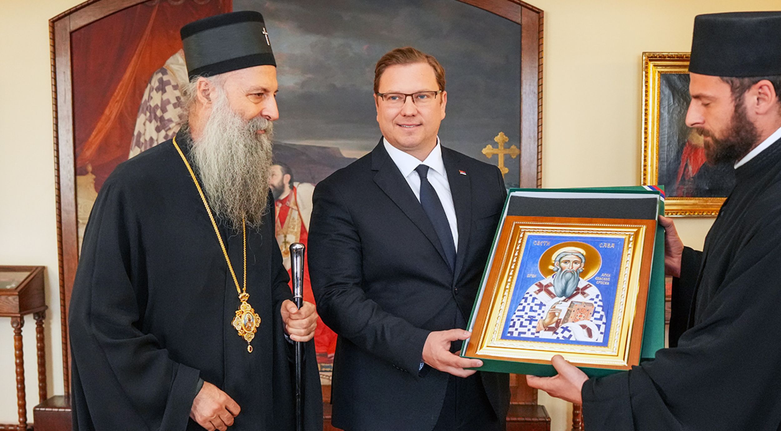 Ο Μακαριώτατος καλωσόρισε τον εκλεκτό προσκεκλημένο και τόνισε ότι εκτιμά ιδιαίτερα τις δραστηριότητες του ιδρύματος που ενδιαφέρεται για τη θέση του σερβικού λαού στην περιοχή και τη διασπορά, τονίζοντας ότι υπό αυτή την έννοια, μαζί με τη Σερβική Ορθόδοξη Εκκλησία, ασχολείται με το σημαντικό αυτό έργο.