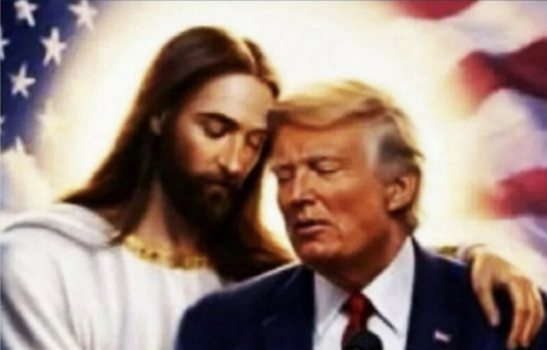 Η εικόνα, που αναδημοσιεύτηκε στον λογαριασμό του Τραμπ στο Truth Social, τον δείχνει με τα μάτια του κλειστά, να κλίνει την κεφαλή προς τον Ιησού. Ο Τραμπ στέκεται πίσω από ένα μικρόφωνο και πίσω του μια αμερικανική σημαία. Η αρχική ανάρτηση είχε τη λεζάντα: «Δεν ήμουν ποτέ ένας ιδιαίτερα θρησκευόμενος άνθρωπος… αλλά δεν φαίνεται, με όλα αυτά τα σατανικά, δαιμονικά, τέρατα που θυσιάζουν παιδιά να αποκαλύπτονται… ότι ο Θεός μπορεί να παίζει το χαρτί Τραμπ!»