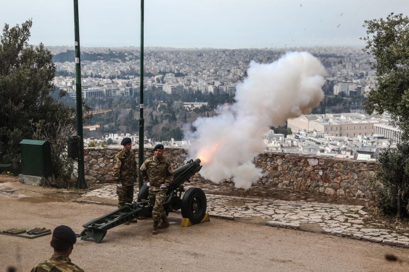 Ο πρώτος κανονιοβολισμός σημειώθηκε στις 6:21 το πρωί, από το πυροβολείο του Λυκαβηττού για να αντηχήσουν ακολούθως άλλοι 20 όπως προβλέπει το καθιερωμένο πρωτόκολλο για να τιμηθεί η ιστορική επέτειος.