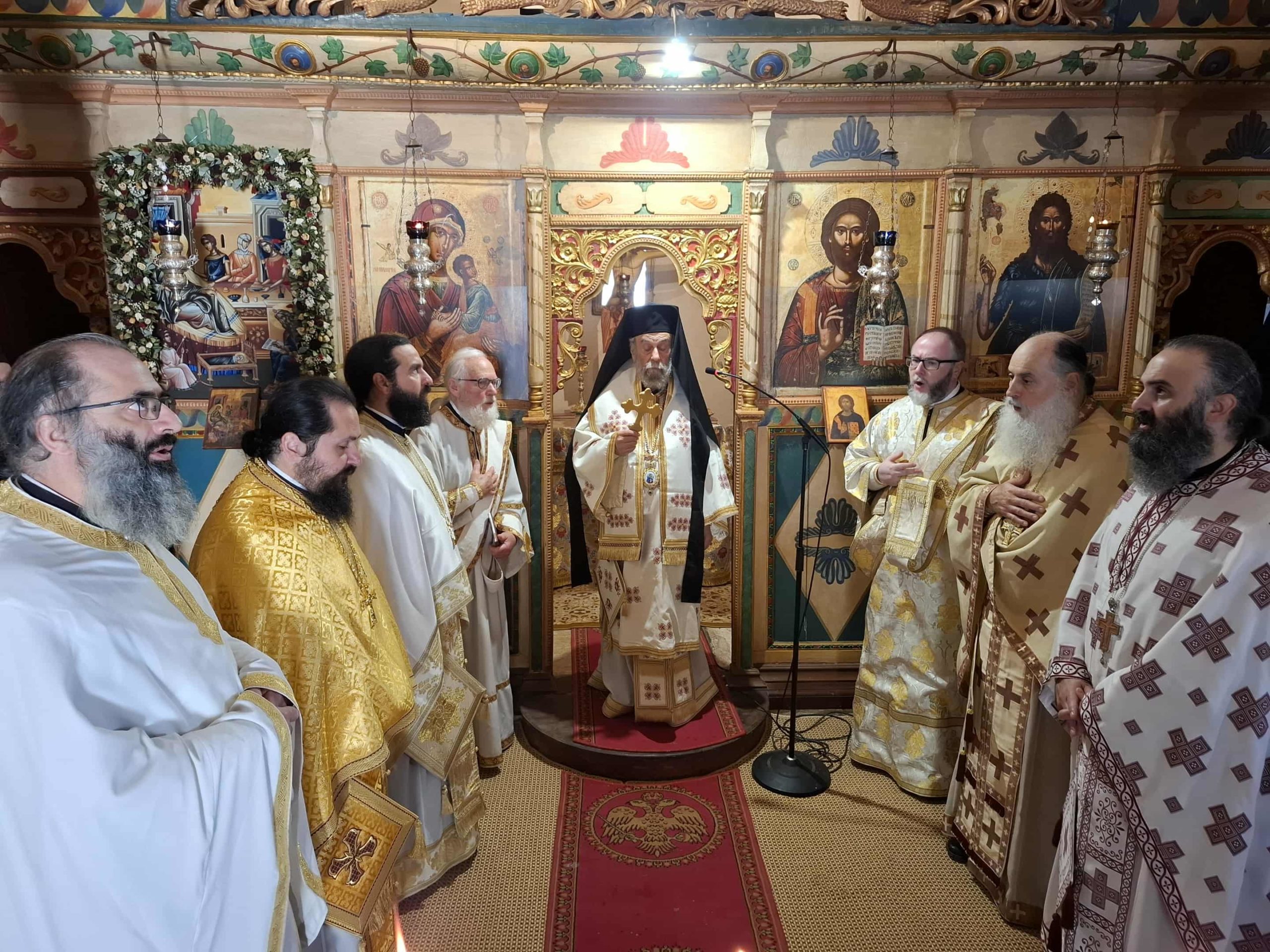 Ο Σεβασμιώτατος τέλεσε την Θεία Λειτουργία συμπαραστατούμενος από τον Πρωτοσύγκελλο της Ιεράς Μητροπόλεως Καρυστίας και Σκύρου, Πανοσιολογιώτατο Αρχιμ. Νικόδημο Πόγκα και τους πατέρες της Ιεράς Μονής, συμπροσευχομένων πολλών άλλων κληρικών, ανάμεσα στους οποίους και ο Γενικός Αρχιερατικός Επίτροπος της Ιεράς Μητροπόλεως Αιδεσιμολογιώτατος Πρωτοπρ. Ελευθέριος Σταμπέλος.