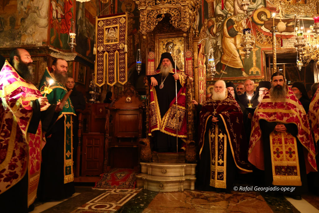 Τους ιερούς ύμνους αποδίδουν με κατάνυξη οι Βατοπαιδινοί Πατέρες. Στο Μεγάλο Συνοδικό της Μονής, όπου αντηλλάγησαν εγκάρδιες προσφωνήσεις και ευχές από τον Μητροπολίτη Λεμεσού κ.Αθανάσιο, τον Γέροντα Εφραίμ, τον Γέροντα Μεθόδιο, καθώς και τον κ. Αλκιβιάδη Στεφανή Πολιτικό Διοικητή του Αγίου Όρους.