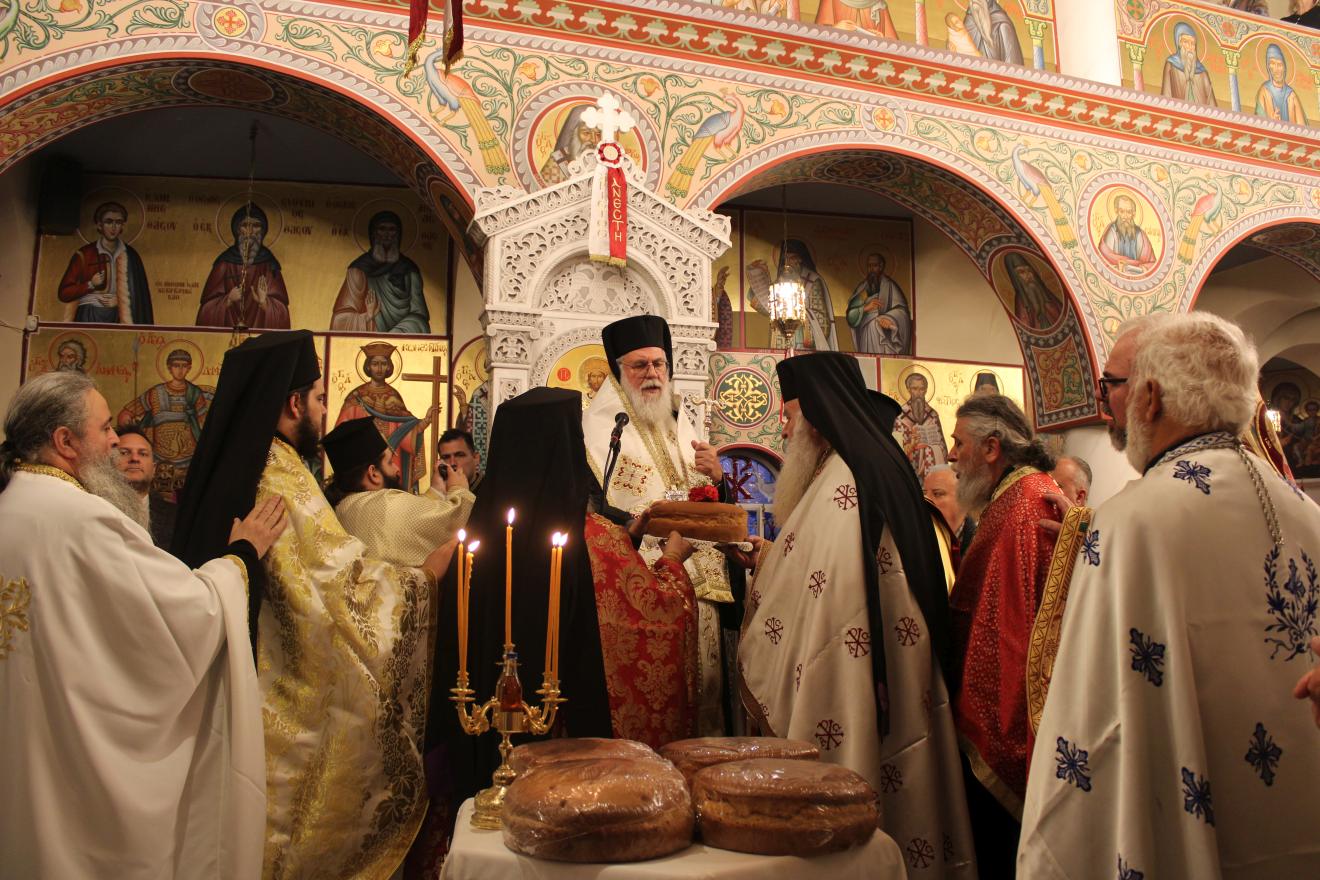 Συμπαραστατούμενος από τους Αρχιμ. Αγαθάγγελο Κόκλα, Ιεροκήρυκα της Ιεράς Μητροπόλεως, Αρχιμ. Νεκτάριο Κιούλο, πρώην ιερέα στην Αστυνομία, Αρχιμ. Ιωάννη Τζεΐρανάκη, Πρόεδρο του ΕΣ του Ιερού ενοριακού Ναού του Αγίου Δημητρίου στα Μυκονιάτικα, Αρχιμ. Ισίδωρο Λαζάκη, εφημέριο του Ιερού ενοριακού Ναού του Γενεσίου της Θεοτόκου στην Νίκαια, π. Κωνσταντίνο Λαμπρόπουλο, Πρόεδρο του ΕΣ του εορτάζοντος Ιερού ναού, π. Δημήτριο Παναγακόπουλο, Πρόεδρο του ΕΣ του Ιερού ενοριακού Ναού Κοιμήσεως της Θεοτόκου Φυλής, π. Θεόδωρο Παπαγιάννη, Πρόεδρο του ΕΣ του Ιερού ενοριακού Ναού της Κοιμήσεως της Θεοτόκου στην Παλατιανή στο Ίλιον, π. Μιχαήλ Τσιρώνη, Πρόεδρο του ΕΣ του Ιερού ενοριακού Ναού των αγίων Κωνσταντίνου και Ελένης στις Αχαρνές, τον π. Θεοφάνη Θεοφάνους, εφημέριο του Ιερού ενοριακού Ναού του Γενεσίου της Θεοτόκου στο Ζεφύρι, Π. Νικόλαο Τάσκα, εφημέριο του Ιερού ενοριακού Ναού των Αγίων Αναργυρων του ομωνύμου δήμου, π. Γεώργιο Χαλιώτη, εφημέριο του Ιερού ενοριακού Ναού του Αγίου Νικολάου Ανακάσης, π. Διονύσιο Λαμπρόπουλο, εφημέριο του Ιερού ενοριακού Ναού του Αγίου Δημητρίου Πετρουπόλεως και τους διακόνους του π. Άγγελο Μιχαλόπουλο και π. Καλλίνικο Ζωγράφο.