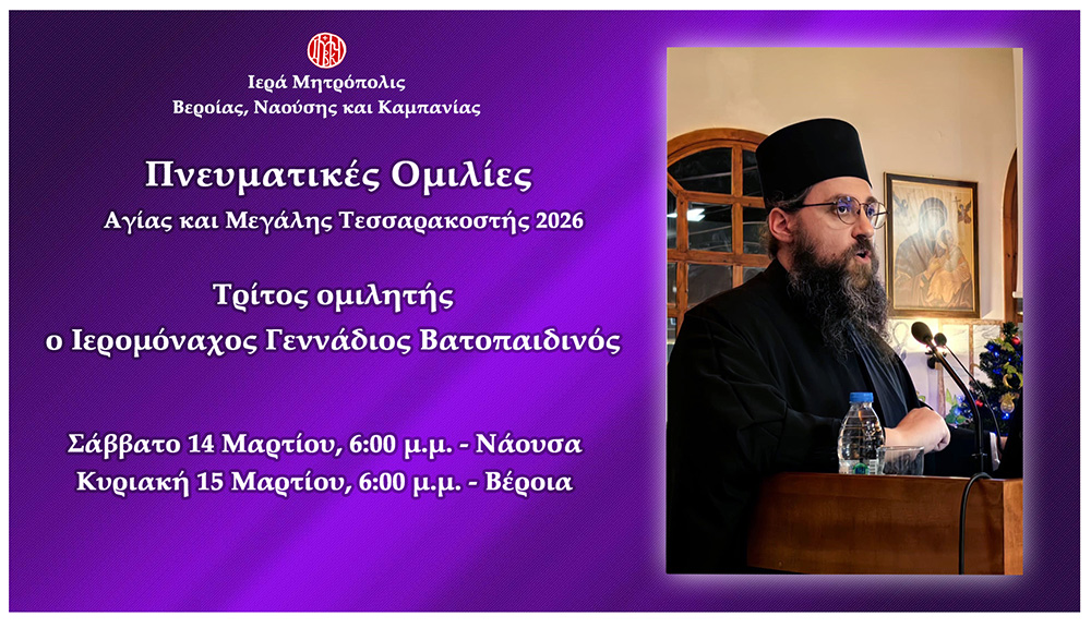Με την πατρική μέριμνα του Σεβασμιωτάτου Μητροπολίτου Βεροίας, Ναούσης και Καμπανίας κ. Παντελεήμονος πραγματοποιούνται για ακόμη μία χρονιά οι πνευματικές ομιλίες κατά τα Σαββατοκύριακα της Αγίας και Μεγάλης Τεσσαρακοστής.