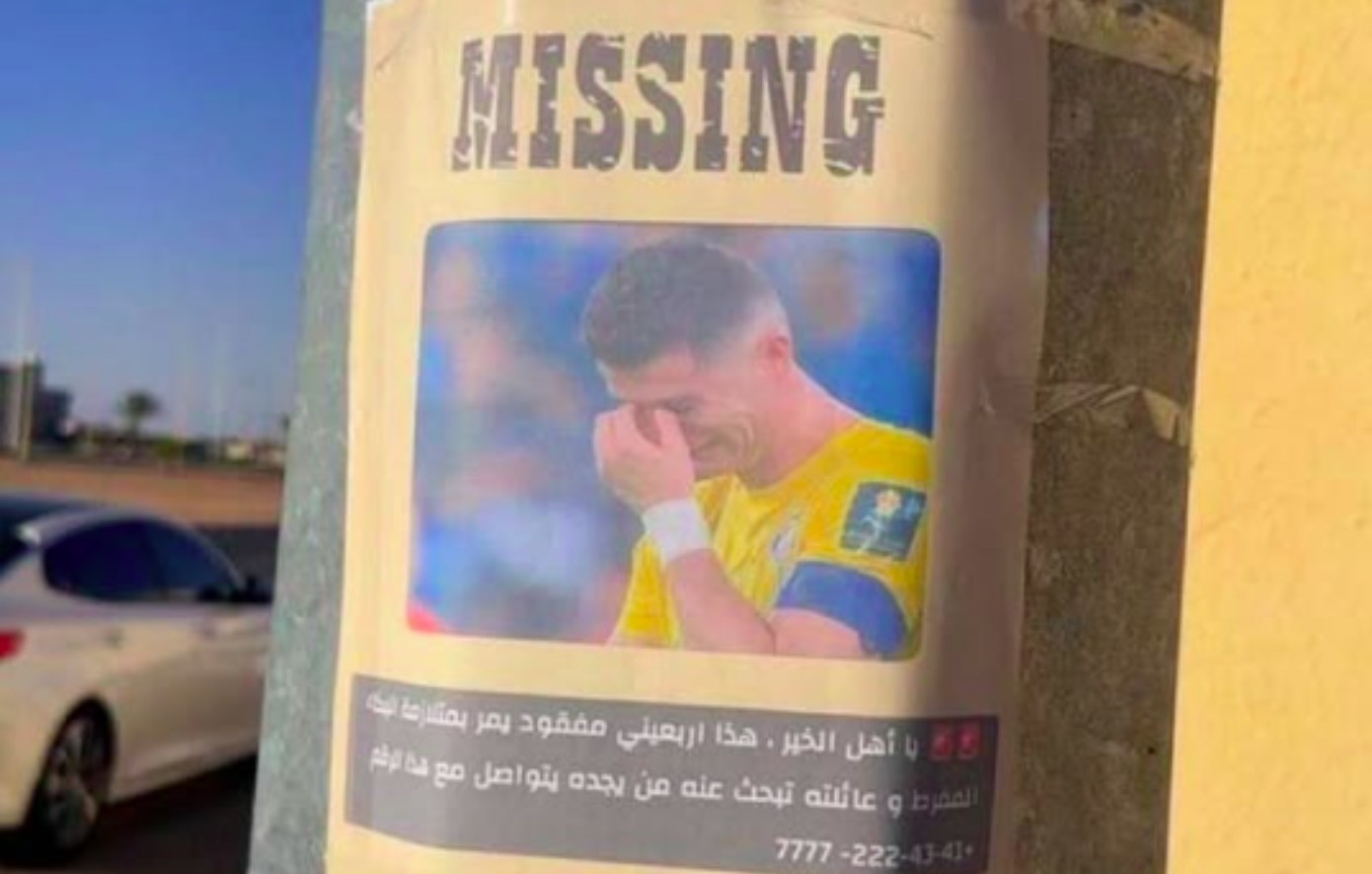 Ο Κριστιάνο Ρονάλντο αρνήθηκε να αγωνιστεί στο ματς της Αλ Νασρ με την Αλ Ριάντ και σκέφτεται να απουσιάσει και από αυτό με την Αλ Ιτιχάντ, με αποτέλεσμα οι φίλαθλοι στη Σαουδική Αραβία να τον… αναζητούν, βάζοντας στους δρόμους αφίσες με τον τίτλο «missing».