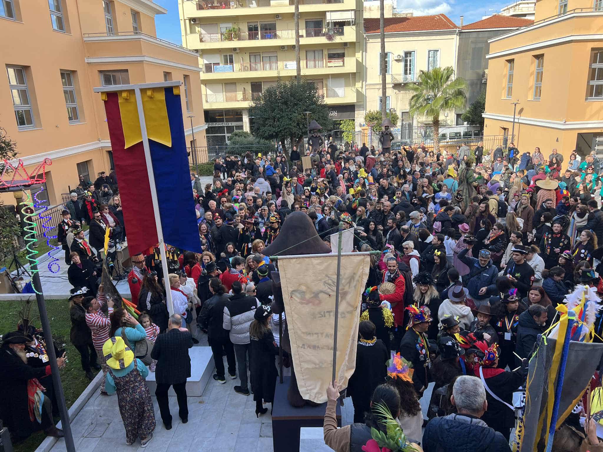Το λάβαρο δόθηκε από το μέλος του Δ.Σ. της ΚΕΔΗΠ-Καρναβάλι Πάτρας Δημήτρη Δημησιάνο στην Τελάλισσα του Πατρινού Καρναβαλιού, Μαρία Αγουρίδη υπό τους ήχους της ομάδας κρουστών “Ritmo Loco Street Band”.