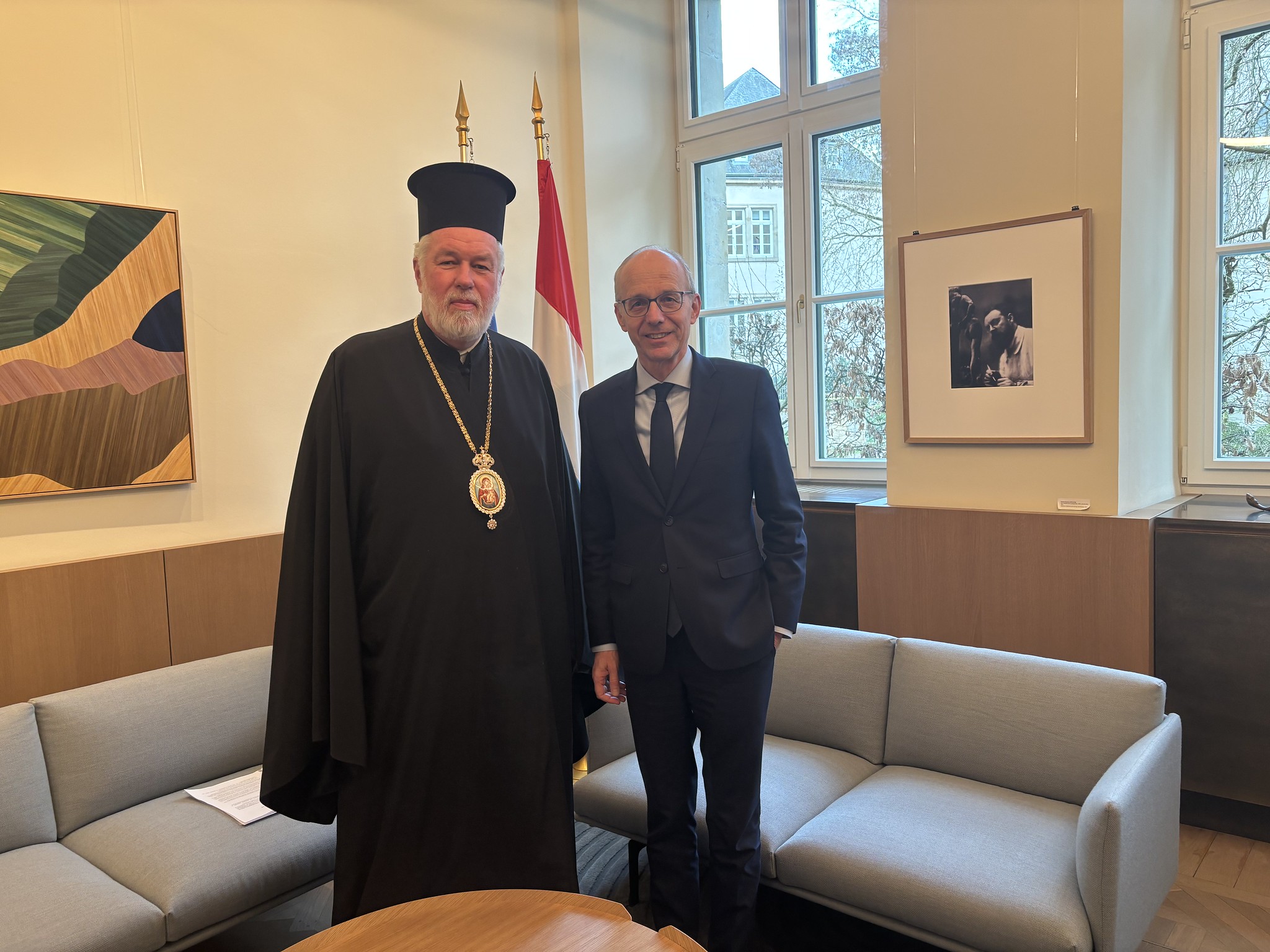Διαδοχικές επισκέψεις στον Πρωθυπουργό κ. Luc Frieden και τον Πρόεδρο της Βουλής των Αντιπροσώπων κ. Claude Wiseler του Λουξεμβούργου πραγματοποίησε ο Σεβασμιώτατος Μητροπολίτης Βελγίου και Έξαρχος Κάτω Χωρών και Λουξεμβούργου κ. Αθηναγόρας, την Δευτέρα 9 Μαρτίου 2026, συνοδευόμενος από τον Πρωτοπρεσβύτερο του Οικουμενικού Θρόνου κ. Παναγιώτη Μοσχονά, Αρχιερατικό Επίτροπο Λουξεμβούργου, και τον Αρχιδιάκονο κ. Παντελεήμονα Μπακάλη.