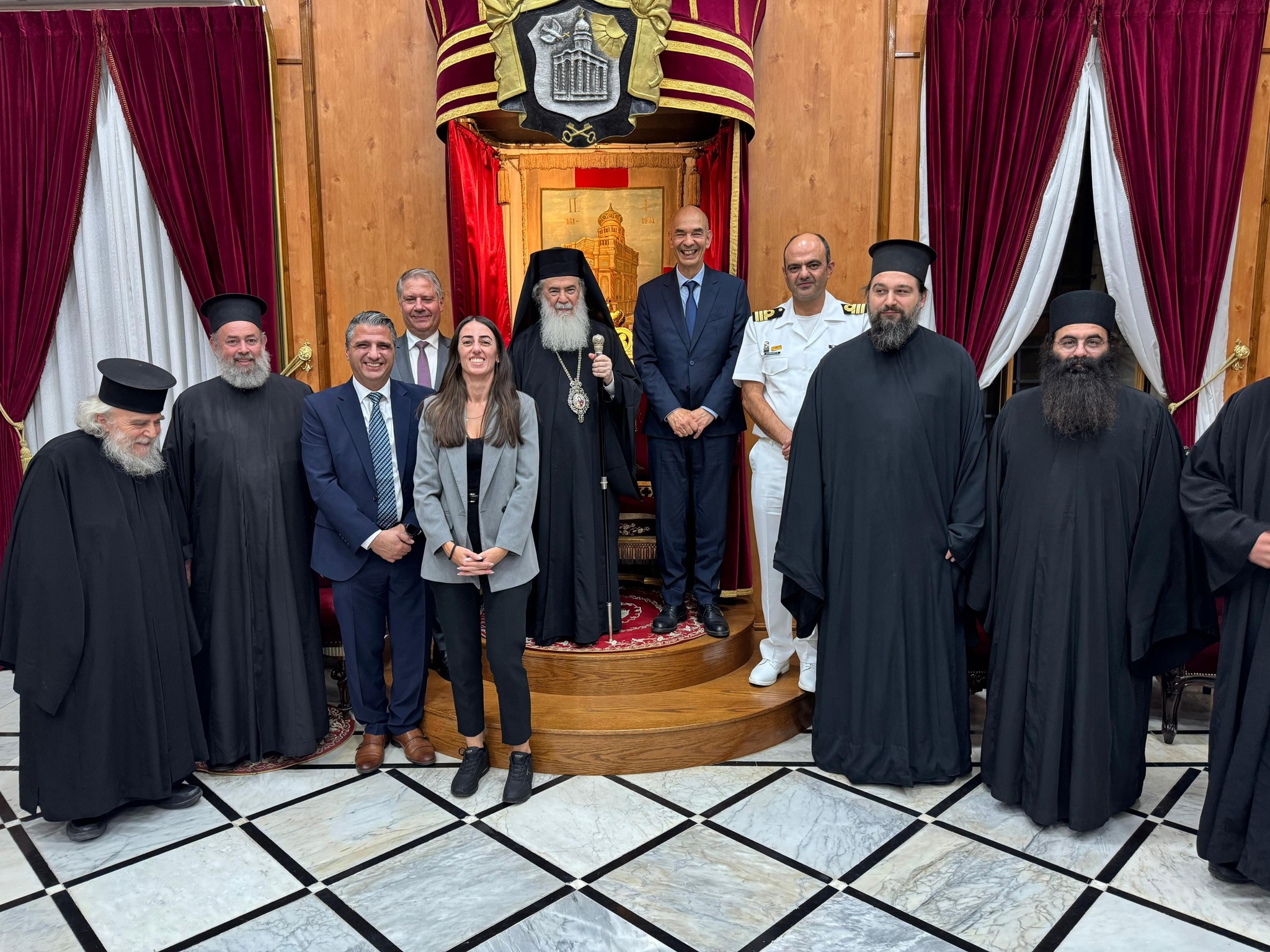 Σε θερμό και εγκάρδιο κλίμα πραγματοποιήθηκε το απόγευμα της Τρίτης 21 Οκτωβρίου 2025, η συνάντηση του Πατριάρχη Ιεροσολύμων κ.κ. Θεοφίλου με τον Υπουργό Μεταφορών, Επικοινωνιών και Έργων της Κύπρου, Αλέξιο Βαφειάδη, ο οποίος συνοδευόταν από τον Πρέσβη της Κύπρου στο Τελ Αβίβ, Κορνήλιο Κορνηλίου, και συνεργάτες του.