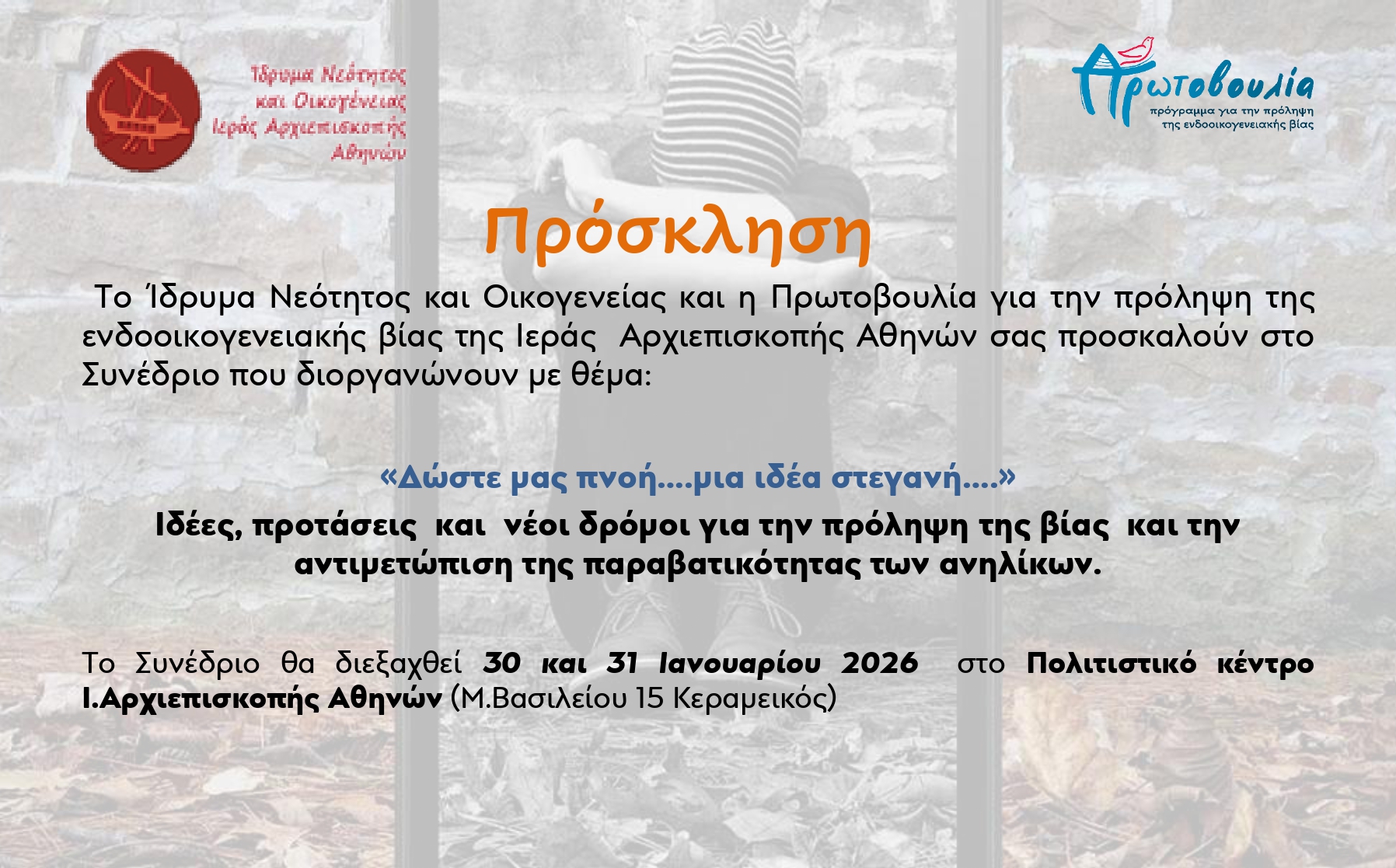 Με αφορμή την εορτή των Τριών Ιεραρχών διοργανώνεται από το Ίδρυμα Νεότητος και Οικογένειας και την Πρωτοβουλία για την πρόληψη της ενδοοικογενειακής βίας συνέδριο με θέμα: