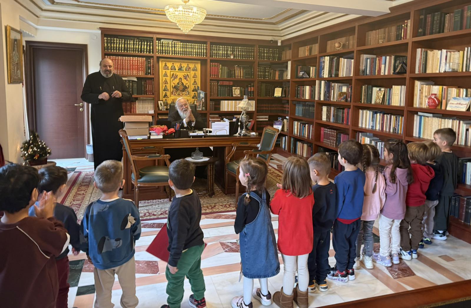 Αντιπροσωπεία των μικρών παιδιών του Βρεφονηπιακού Σταθμού «ΕΛΕΝΗ ΜΠΕΛΛΟΥ» της Ιεράς Μητροπόλεως τον επισκέφθηκε, μαζί με τη διευθύντρια κ. Κέλλυ Καρύδη και τις παιδαγωγούς, και του είπαν τα κάλαντα και του έδωσαν τις παιδικές ωραίες ευχές τους για τις άγιες ημέρες.