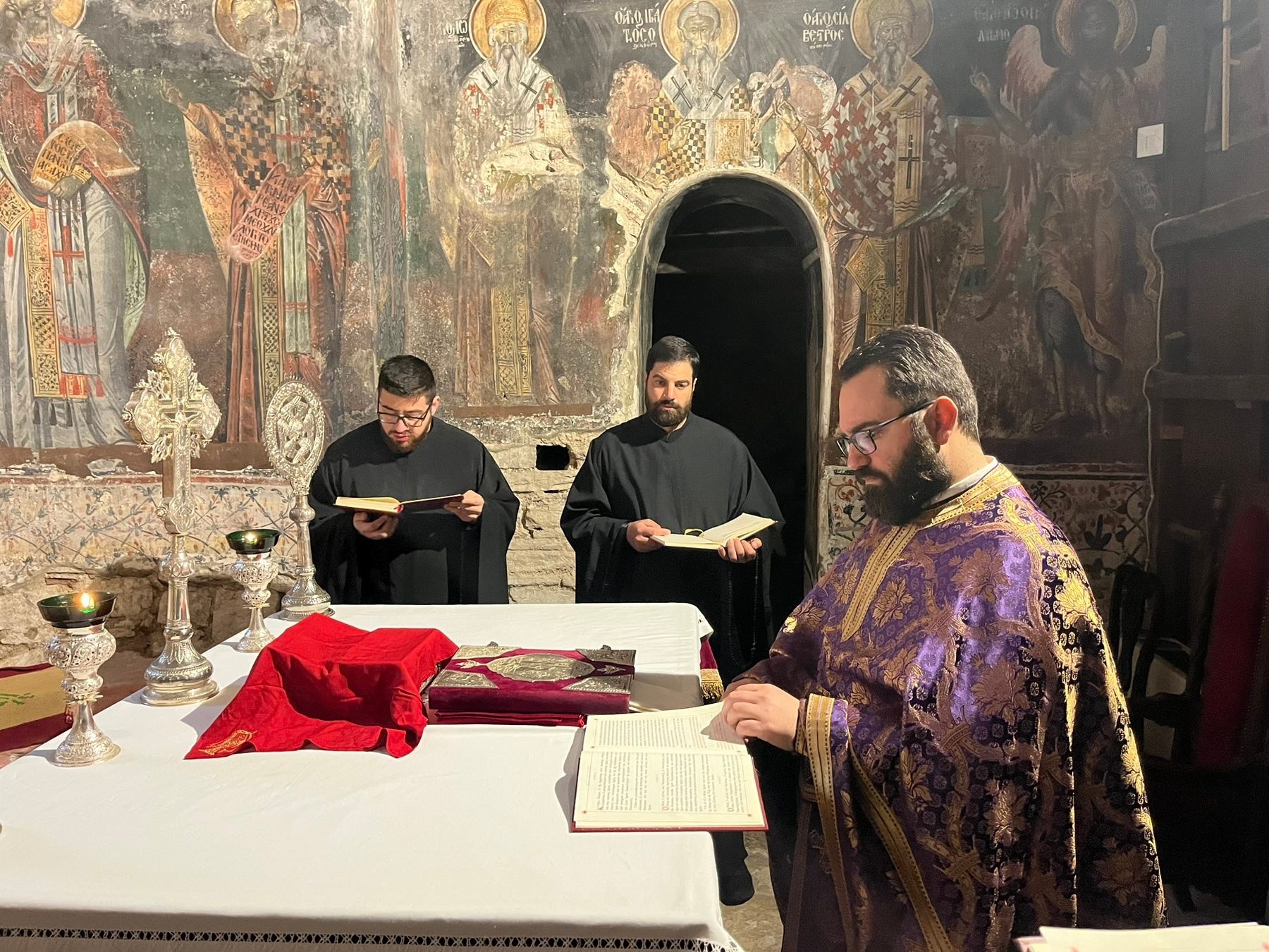 Τελέσθηκε σήμερα, Παρασκευή 27 Μαρτίου, η Θεία Λειτουργία των Προηγιασμένων Τιμίων Δώρων στο Καθολικό της Ιεράς Μονής Παναγίας Βελλάς. Την Θεία Λειτουργία τέλεσε ο καθηγητής της Σχολής Μαθητείας Υποψηφίων Κληρικών π. Σωτήριος Κανέλλης, με την συμμετοχή των φοιτητών της Σχολής, οι οποίοι διακόνησαν στο Ιερό Βήμα και στο αναλόγιο.